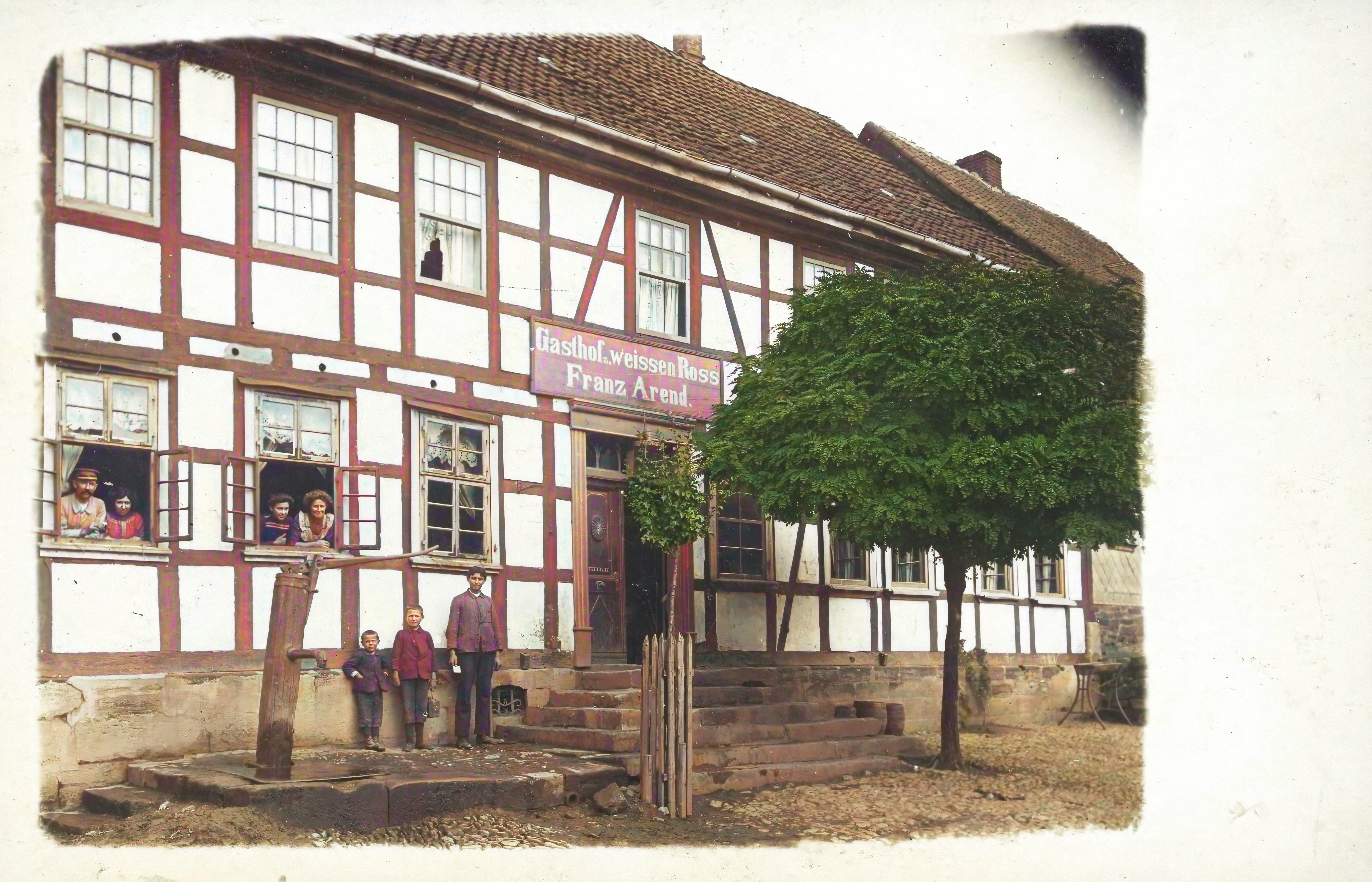 Ort Rhumspringe Beschreibung oben: original unten: verbessert Motive Gasthof z. weissen Ross Franz Arend Hauptstraße 25 Format klein Verlag A. H. W. Wendrich, Altona Bestell- oder Individualnummer - Tags Schwengelpumpe Gasthaus zum weißen Roß