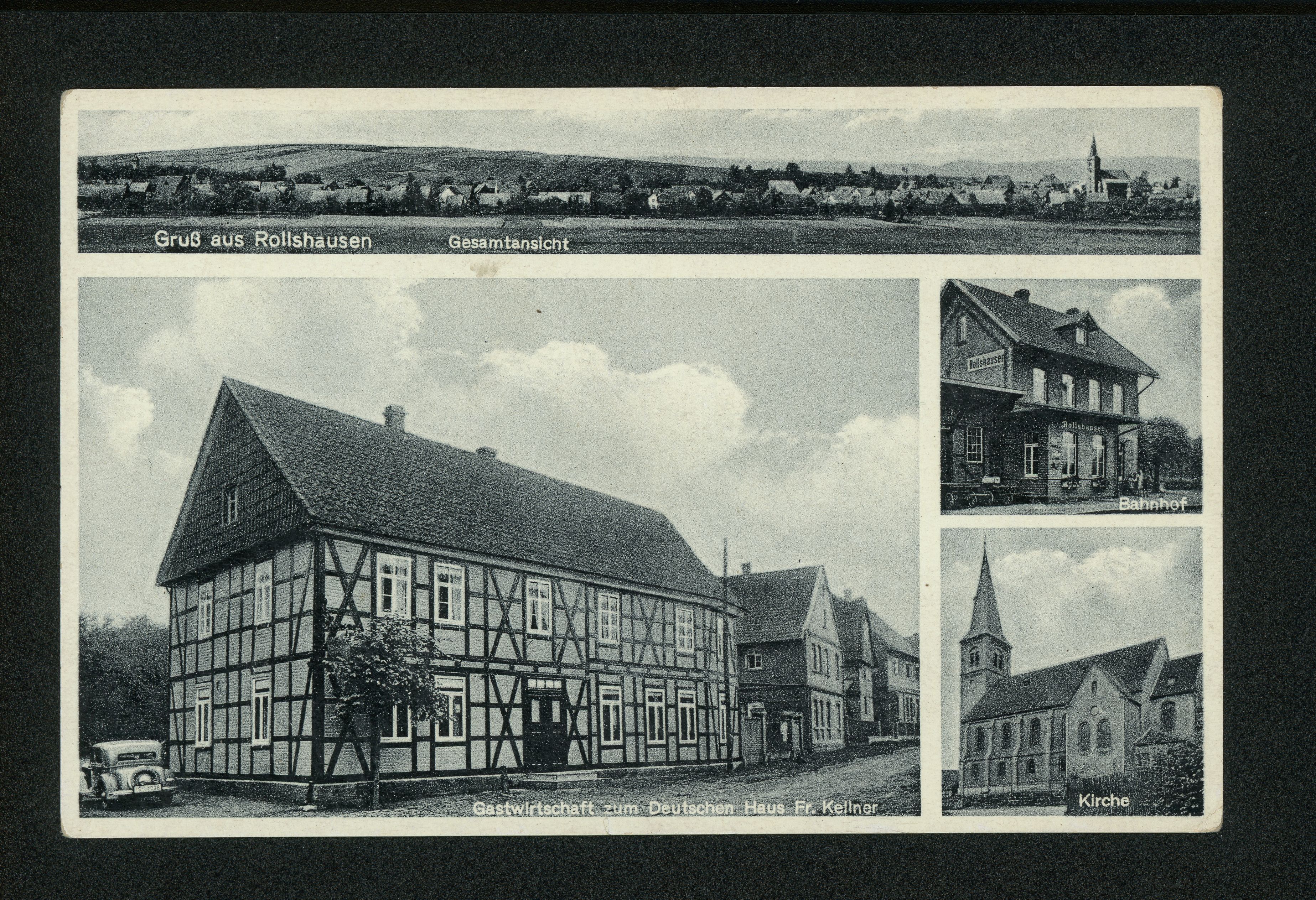 Ort Rollshausen Motive Gesamtansicht Gastwirtschaft zum Deutschen Haus Fr. Kellner Kirche Bahnhof Format klein Verlag Gebrüder Seseke, Duderstadt Bestell- oder Individualnummer Nr. 297 Y 71 Tags Gasthaus PKW