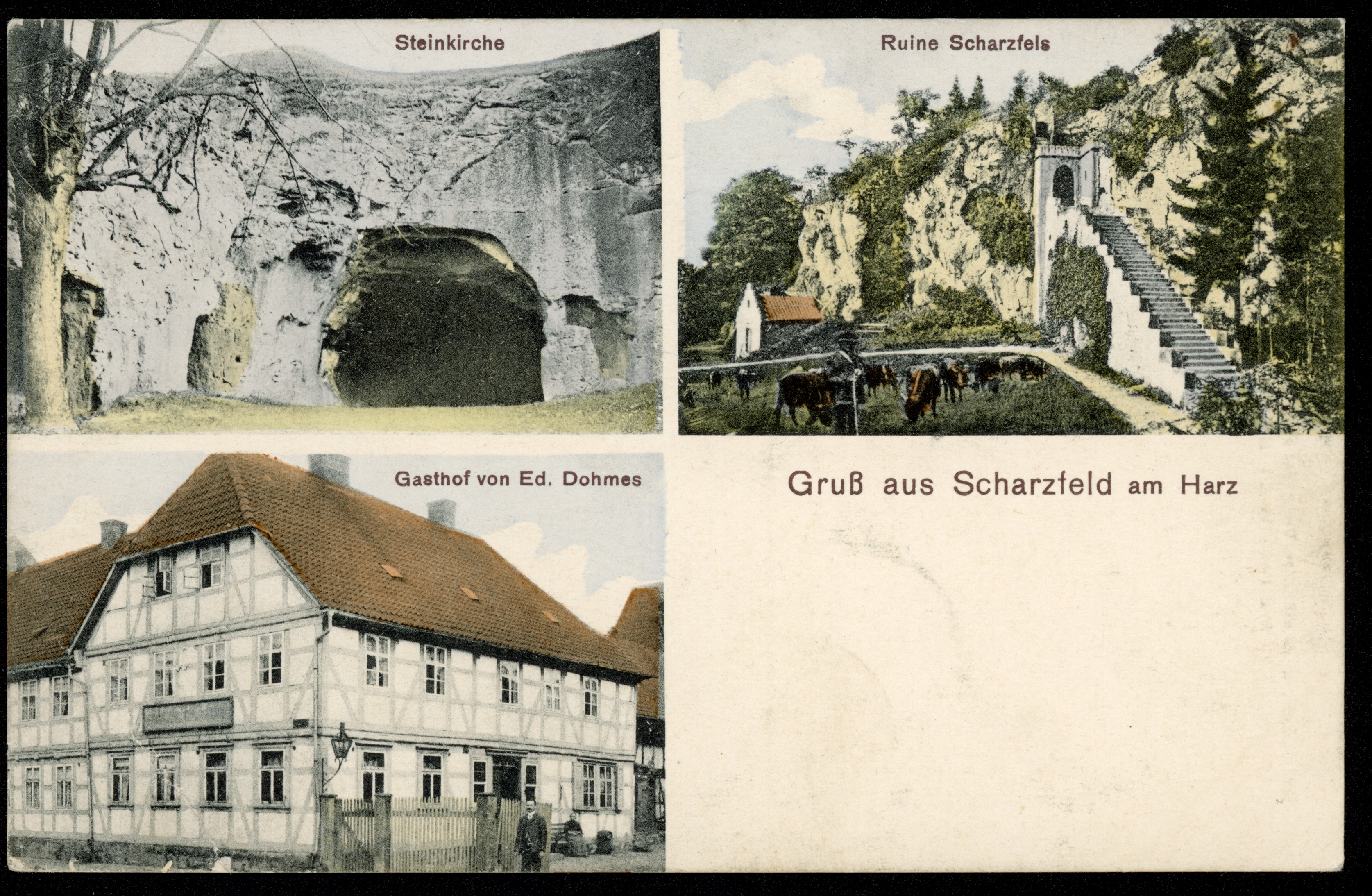 Ort Scharzfeld Motive Steinkirche Ruine Scharzfels Gasthof von Ed. Dohmes Format klein Jahr 1913 Verlag Otto Künemund, Lauterberg a/Harz Bestell- oder Individualnummer - Tags Gasthaus Burg Scharzfels