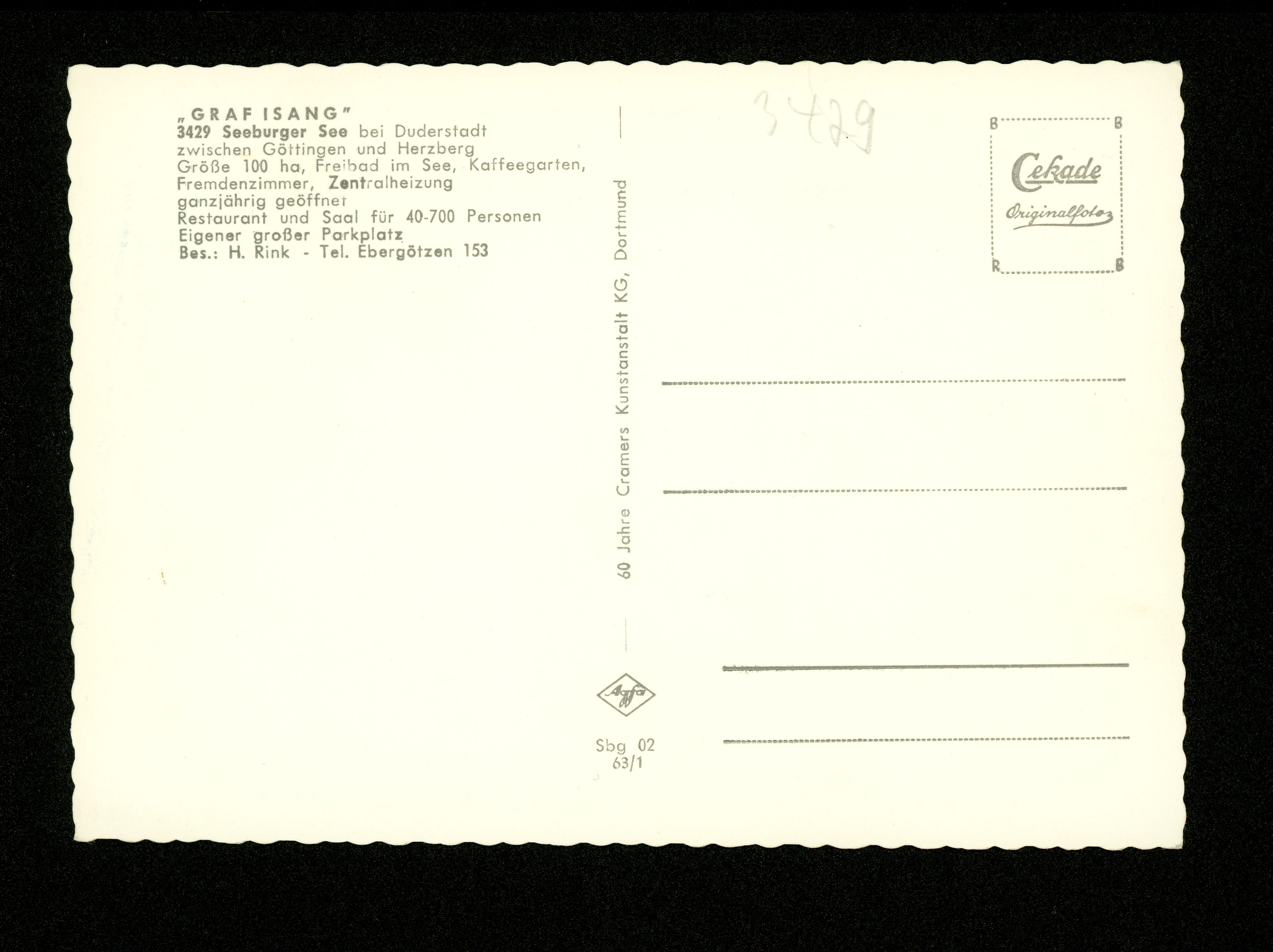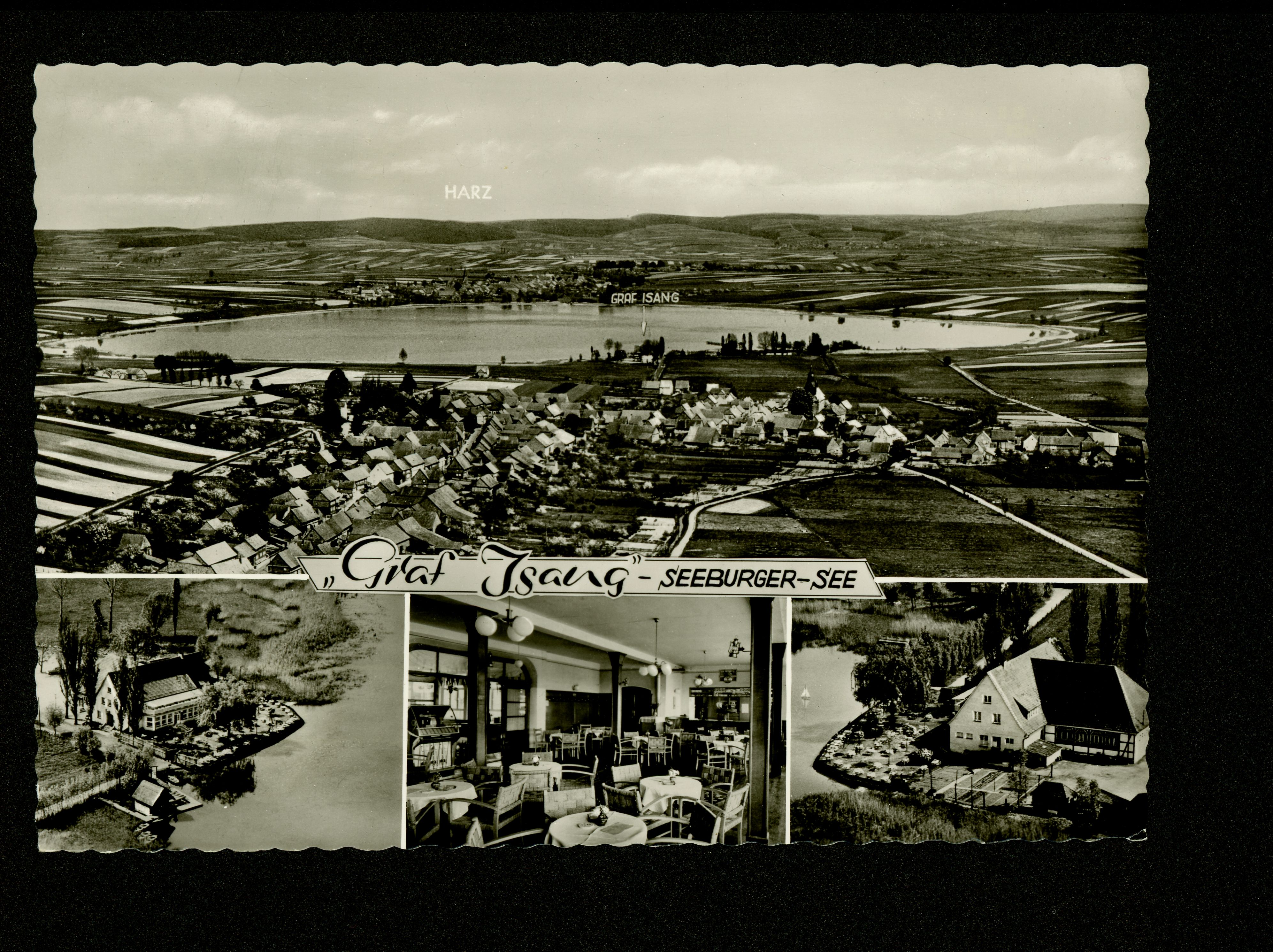 Ort Seeburg Motive ''Graf Isang'' - Seeburger See Luftbild Format groß Jahr 1963 Verlag Cramers Kunstanstalt, Dortmund Bestell- oder Individualnummer Sbg 02 63/1 Tags Bernshausen H. Rink Gasthaus