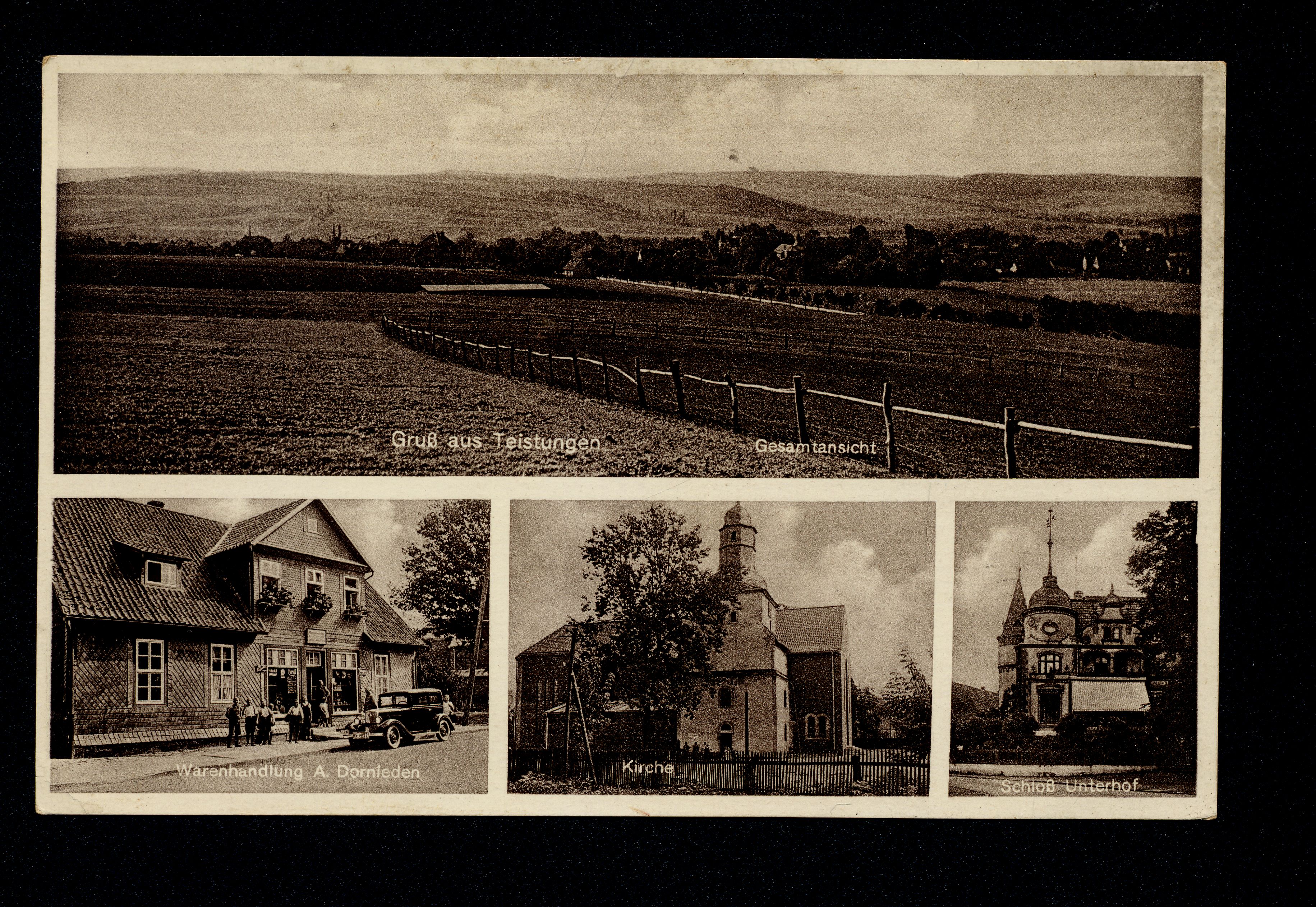 Ort Teistungen Beschreibung Variante "braun" Motive Gesamtansicht Warenhandlung A. Dornieden Kirche Schloß Unterhof Format klein Verlag Gebrüder Seseke, Duderstadt Bestell- oder Individualnummer Nr. 189 E 88
