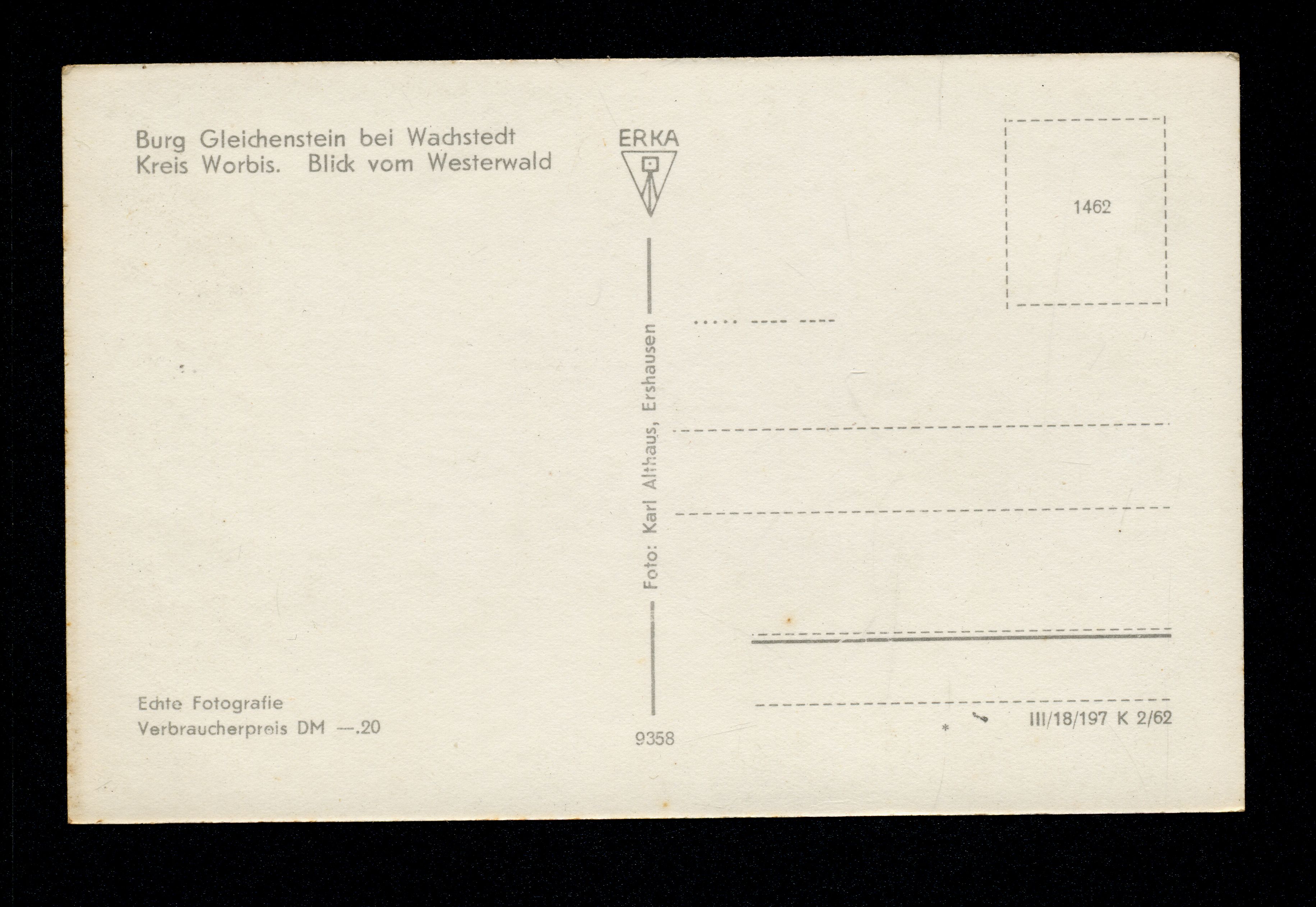 Ort Wachstedt Motive Burg Gleichenstein bei Wachstedt Kreis Worbis. Blick vom Westerwald Format klein Jahr 1962 Verlag Karl Althaus, Ershausen Bestell- oder Individualnummer 9358 III/18/197 K 2/62 1462