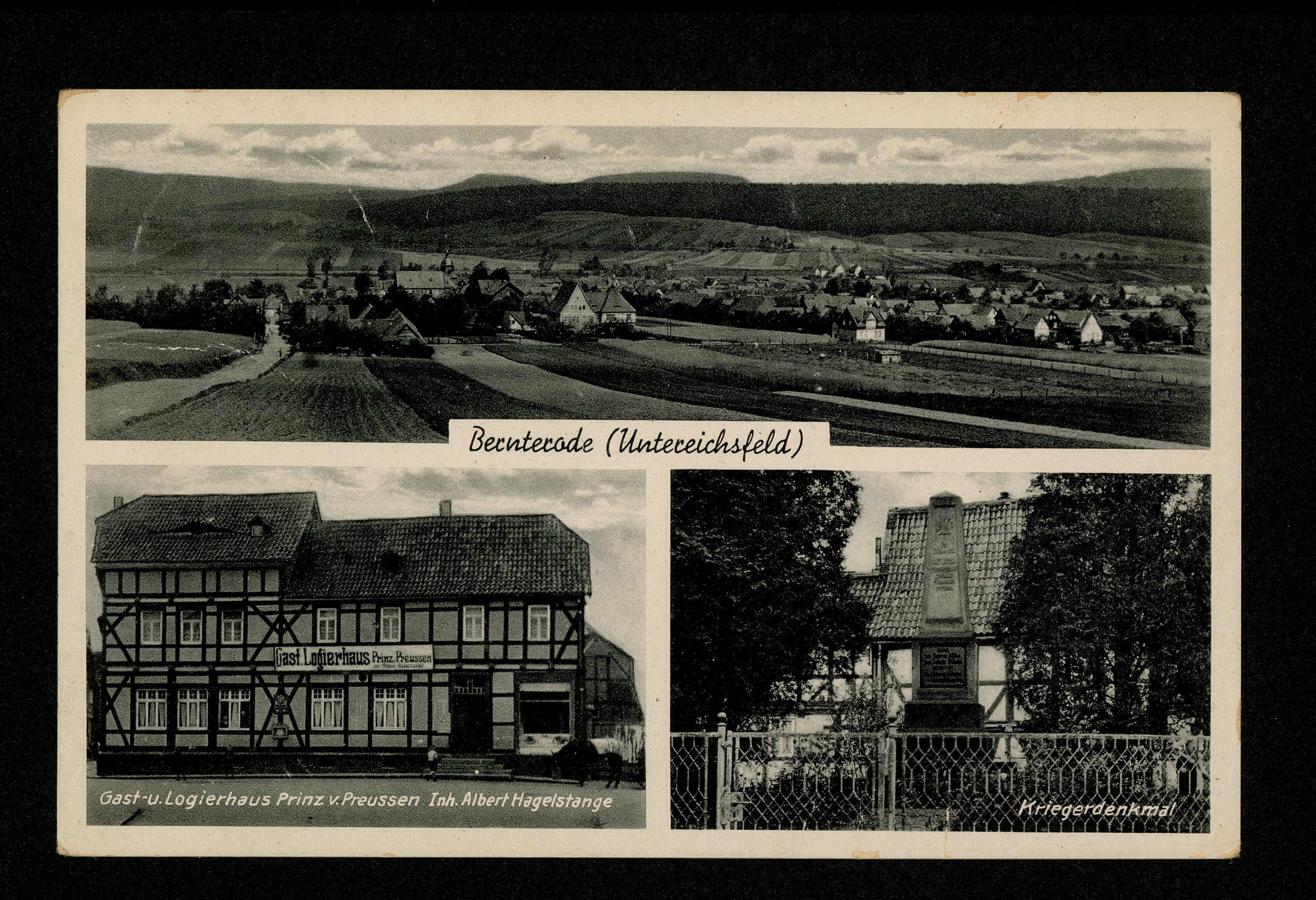 Ort Bernterode (Breitenworbis) Motive Panorama Gast- u. Logierhaus Prinz v. Preußen Inh. Albert Hagelstange Kriegerdenkmal Format klein Verlag Johannes Haber, Duderstadt Bestell- oder Individualnummer E ''unleserlich'' Tags Gasthaus