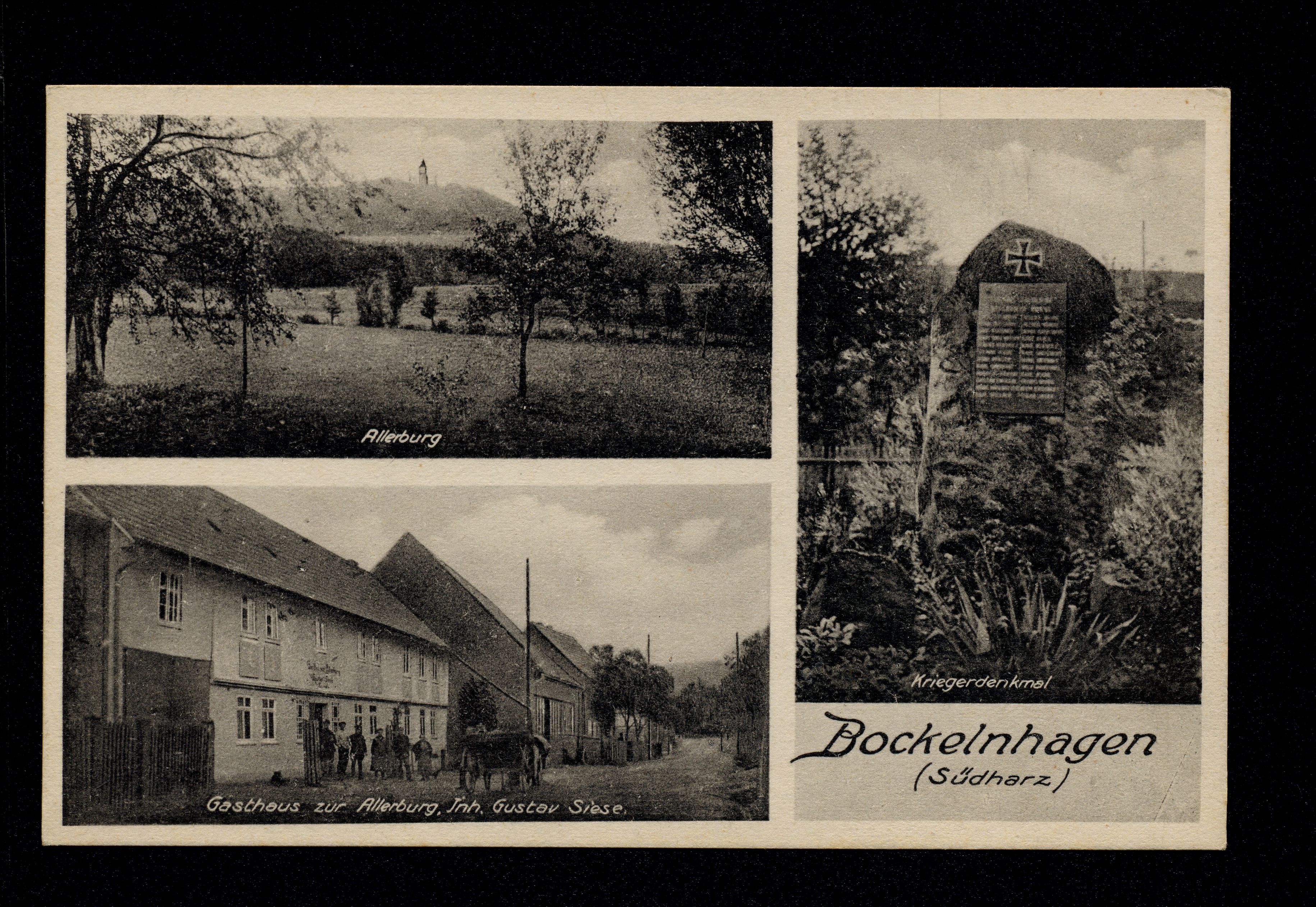 Ort Bockelnhagen Motive Allerburg Kriegerdenkmal Gasthaus zur Allerburg, Inh. Gustav Siese Format klein Verlag Aloys Mecke, Duderstadt Bestell- oder Individualnummer e 81169 Tags Burg Allerburg