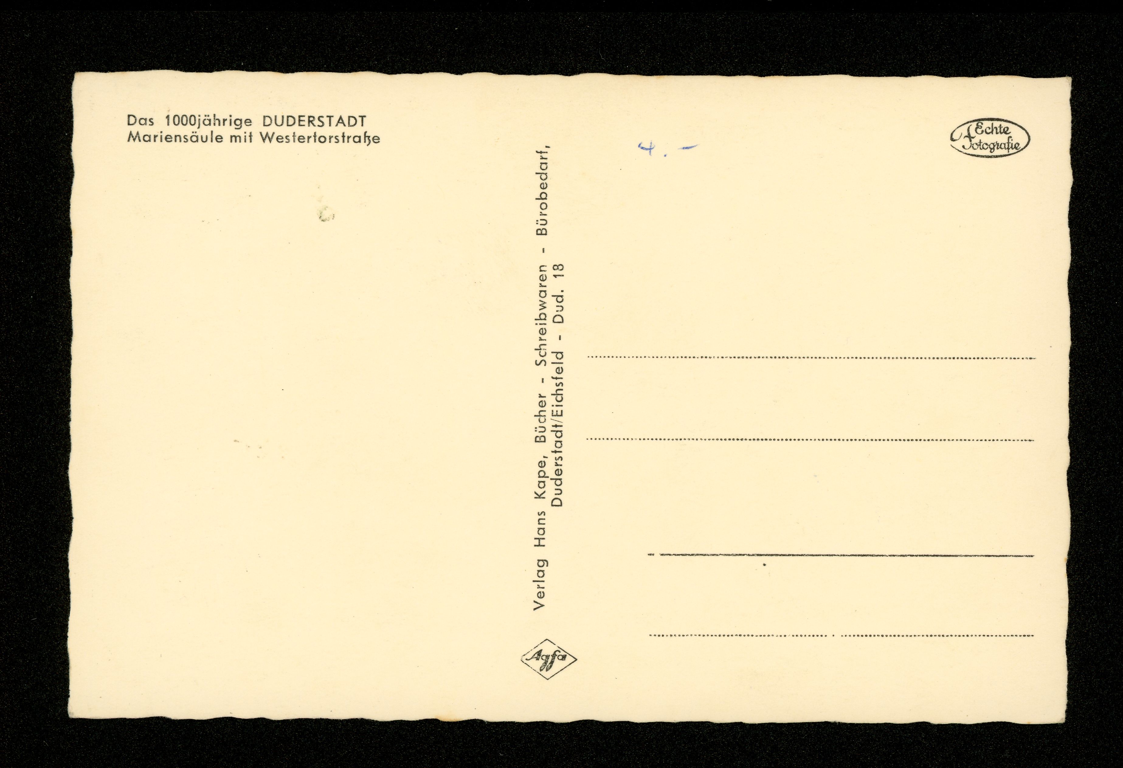 Ort Duderstadt Motive Mariensäule mit Westertorstraße Format klein Verlag Hans Kape, Duderstadt / Eichsfeld Bestell- oder Individualnummer Dud 18 Tags Gasthof zum weissen Ross Wilhelm Stockfisch Madonna im Lindenzaun