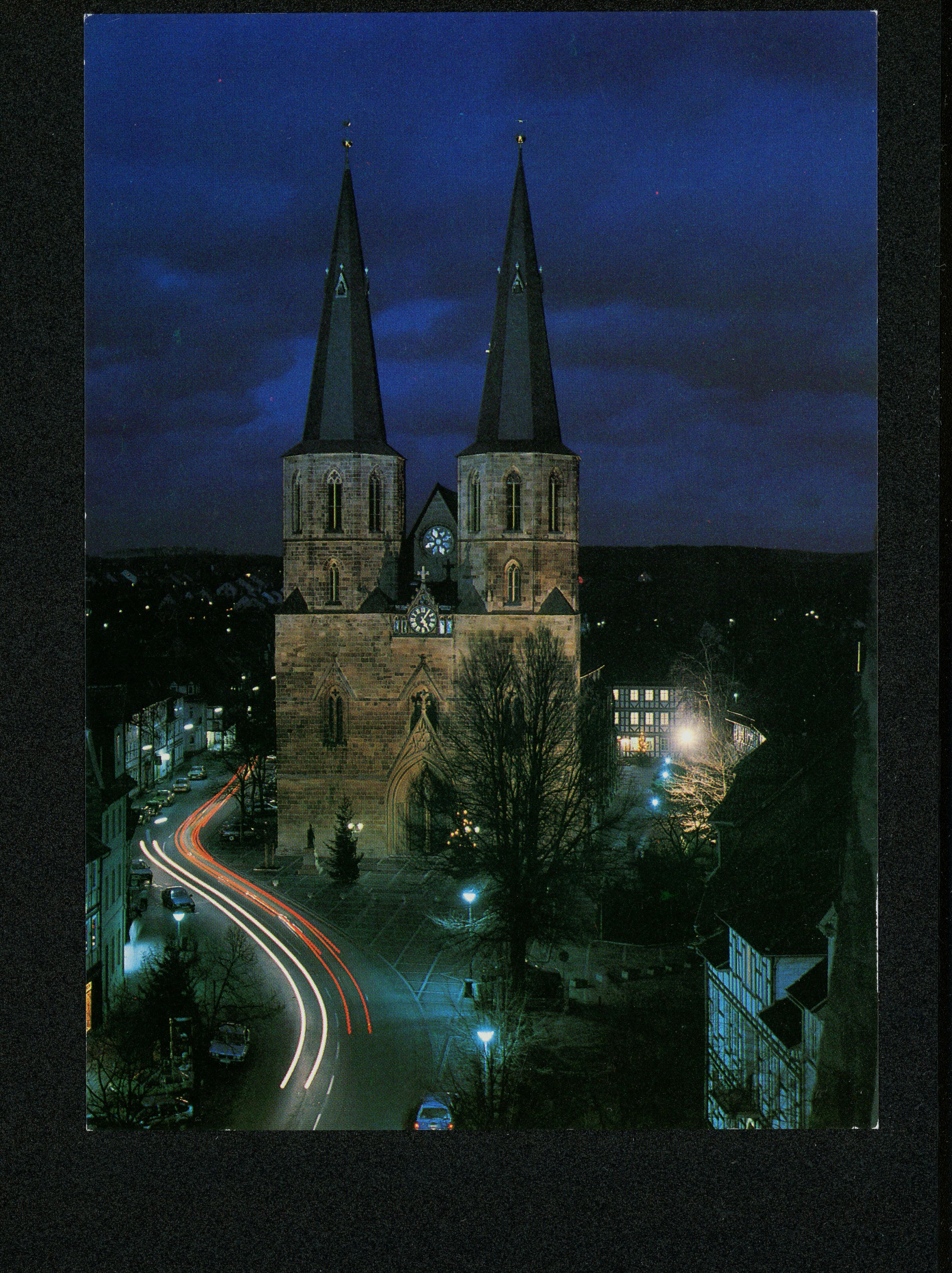 Ort Duderstadt Motive Obermarkt und St. Cyriakus, Nachtaufnahme Format groß Jahr 1988 Verlag Aloys Mecke, Duderstadt Bestell- oder Individualnummer - Tags Marktstraße