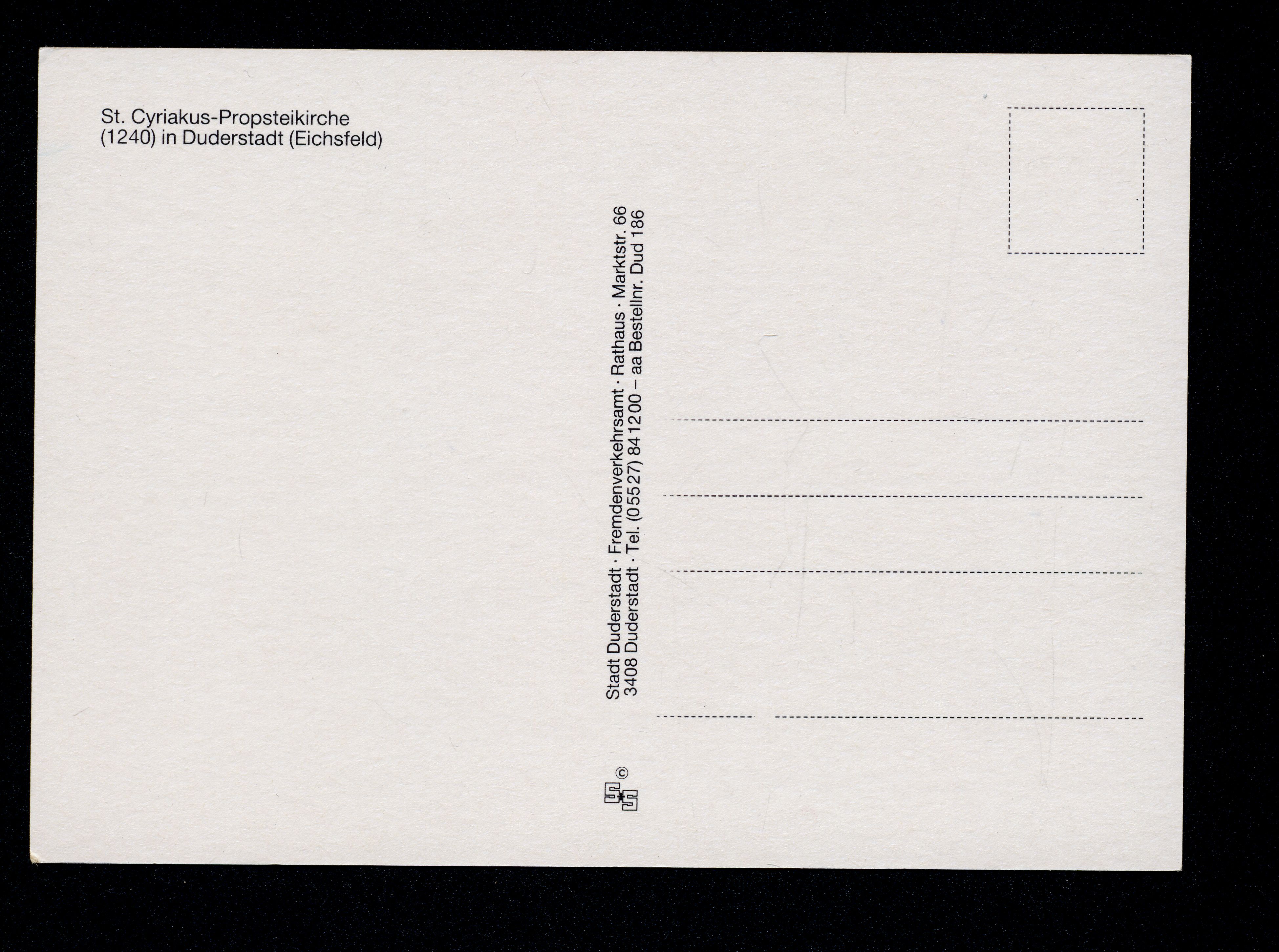 Ort Duderstadt Motive St. Cyriakus-Propsteikirche Format groß Verlag Stadt Duderstadt - Fremdenverkehrsamt Bestell- oder Individualnummer aa Bestellnr. Dud 186 Tags Mariensäule