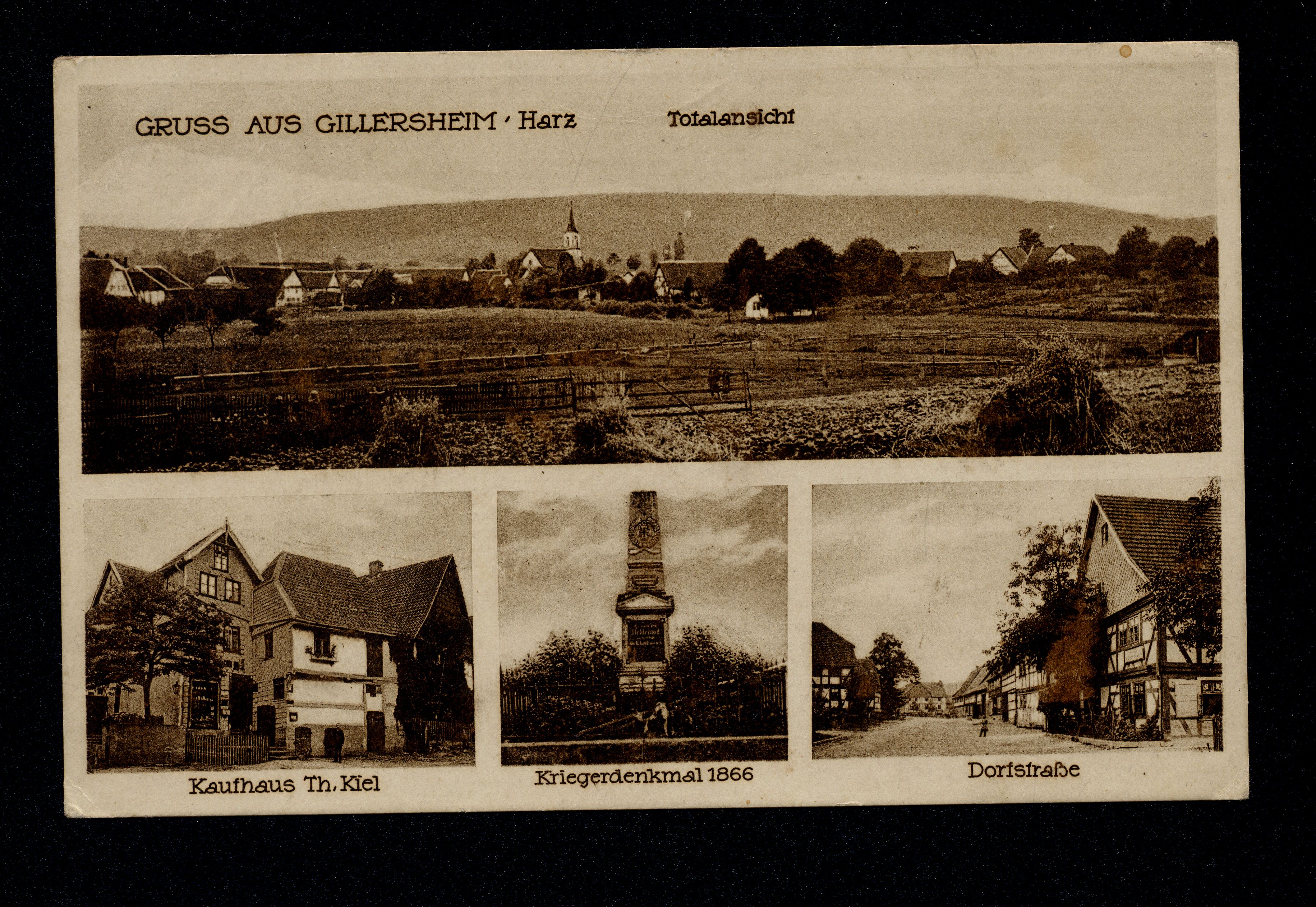 Ort Gillersheim Beschreibung Variante Motive Totalansicht Kaufhaus Th. Kiel Kriegerdenkmal 1866 Dorfstraße Format klein Verlag Alfred Ulbrich, Völkershausen-Wanfried (A. Ulbrich) Bestell- oder Individualnummer 24736