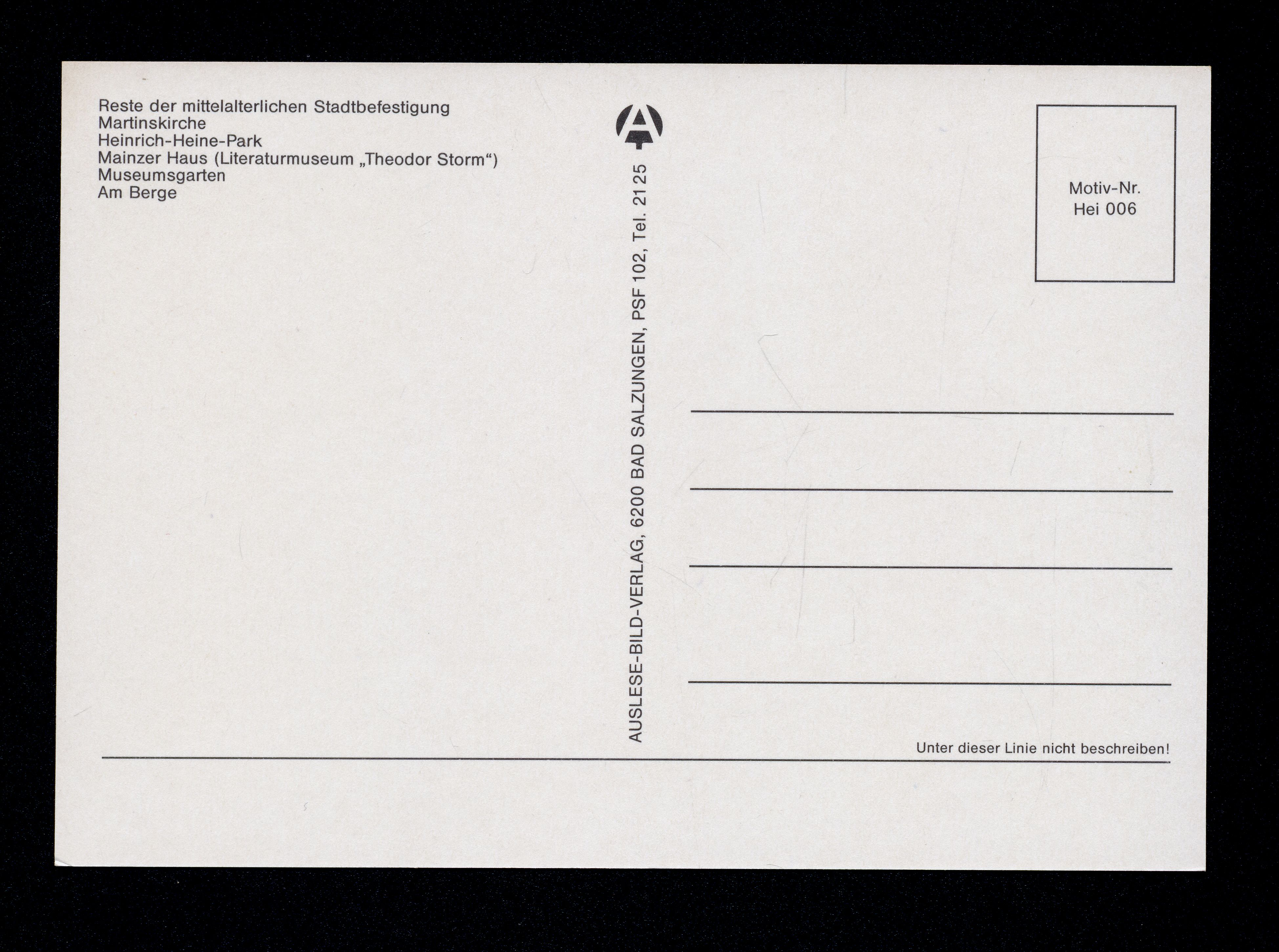 Ort Heiligenstadt Motive Reste der mittelalterlichen Stadtbefestigung Martinskirche Heinrich-Heine-Park Mainzer Haus (Literaturmuseum "Theodor Storm") Format groß Verlag Auslese-Bild-Verlag, Bad Salzungen Bestell- oder Individualnummer Motiv-Nr. Hei 006