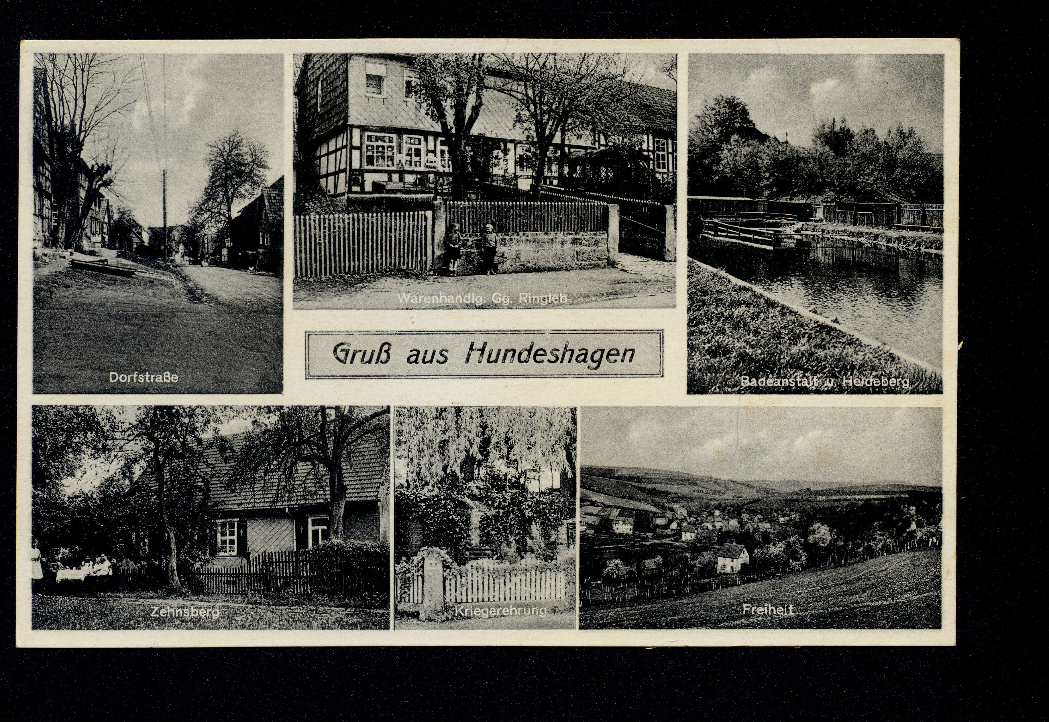 Ort Hundeshagen Motive Dorfstraße Warenhandlg. Gg. Ringleb Badeanstalt u. Heideberg Zehnsberg Kriegerehrung Freiheit Format klein Verlag Gebrüder Seseke, Duderstadt Bestell- oder Individualnummer Nr. 170 D 2 Tags Kriegerdenkmal Freibad Försterei Forsthaus Zehnsberg Warenhandlung Drogerie Flaschenbier Verkauf Cigarren & Cigaretten Georg Ringleb