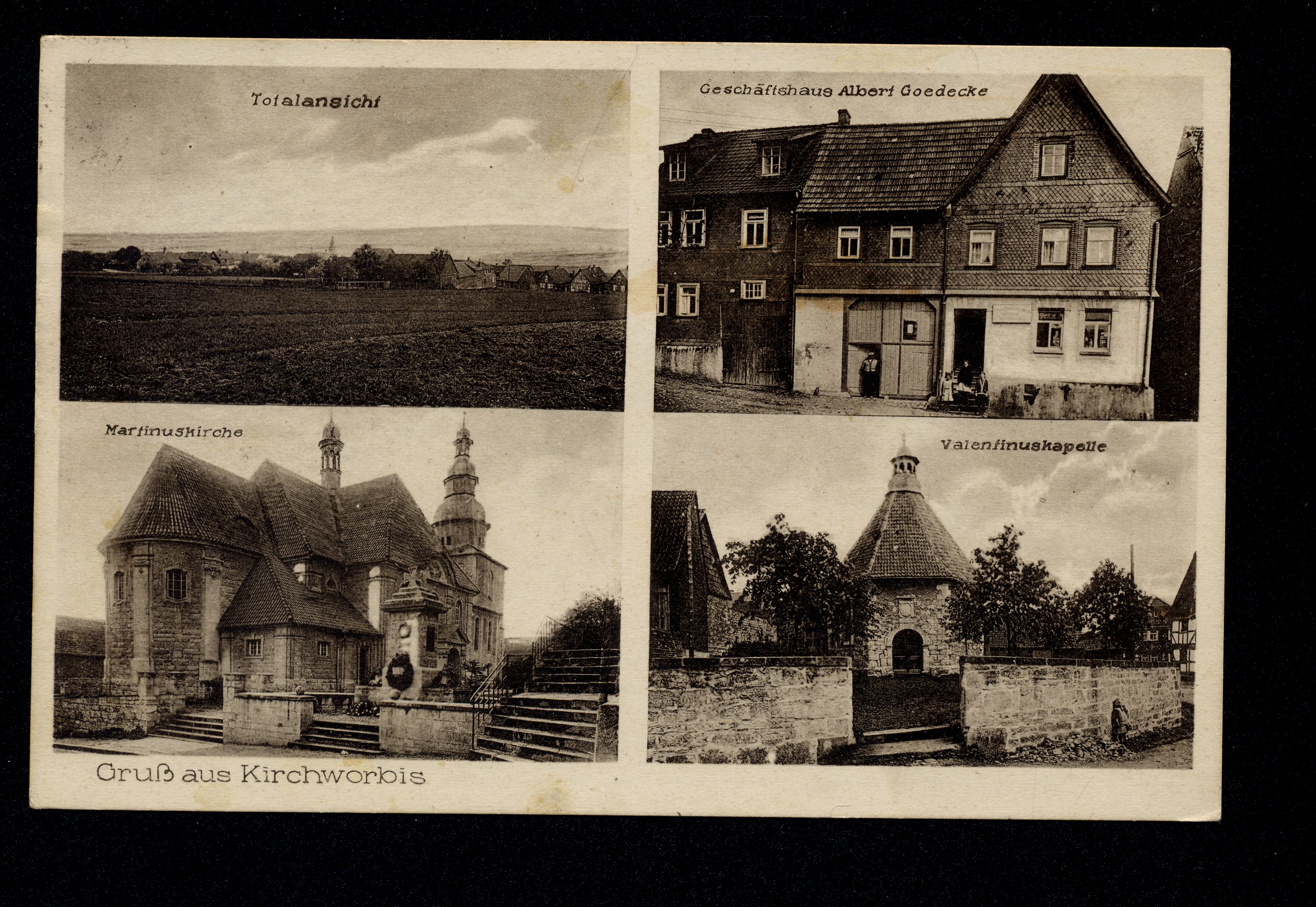Ort Kirchworbis Motive Totalansicht Martinuskirche Valentinuskapelle Geschäftshaus Albert Gödecke Format klein Jahr 1932 Verlag Engel & Rotax, Hannover Bestell- oder Individualnummer 27368