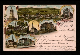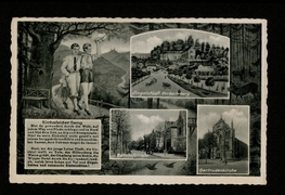 Krieger-Denkmal, Total-Ansicht v. Dingelstädt, Gertruden-Kirche, Krankenhaus, Evangelische Kirche, Kerbsche Berg m. Franziskaner Kirche und Kloster, Marienkirche, St. Joseph-Institut |