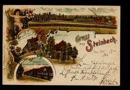 Totalansicht von Steinbach, Wallfahrtsort Ezelsbach, Gast u. Schenk-Wirtschaft v. Wwe Heinrich Reimann, Hauptstrasse m. Gastwirthschaft v. Franz Hartung |