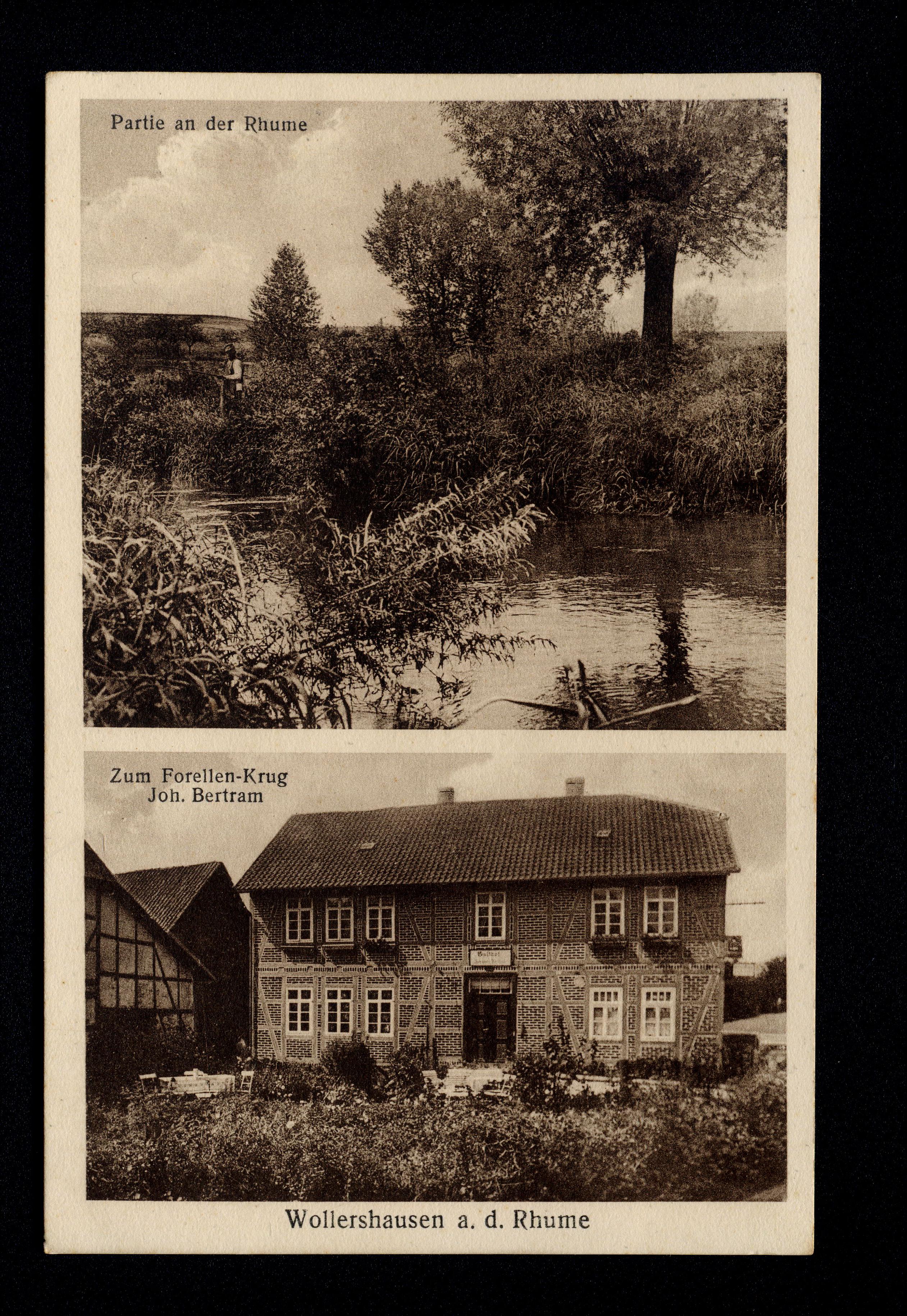 Ort Wollershausen Motive Partie an der Rhume Zum Forellen-Krug Joh. Bertram Format klein Verlag Gebrüder Seseke, Duderstadt Bestell- oder Individualnummer U 44 Tags Forellenkrug