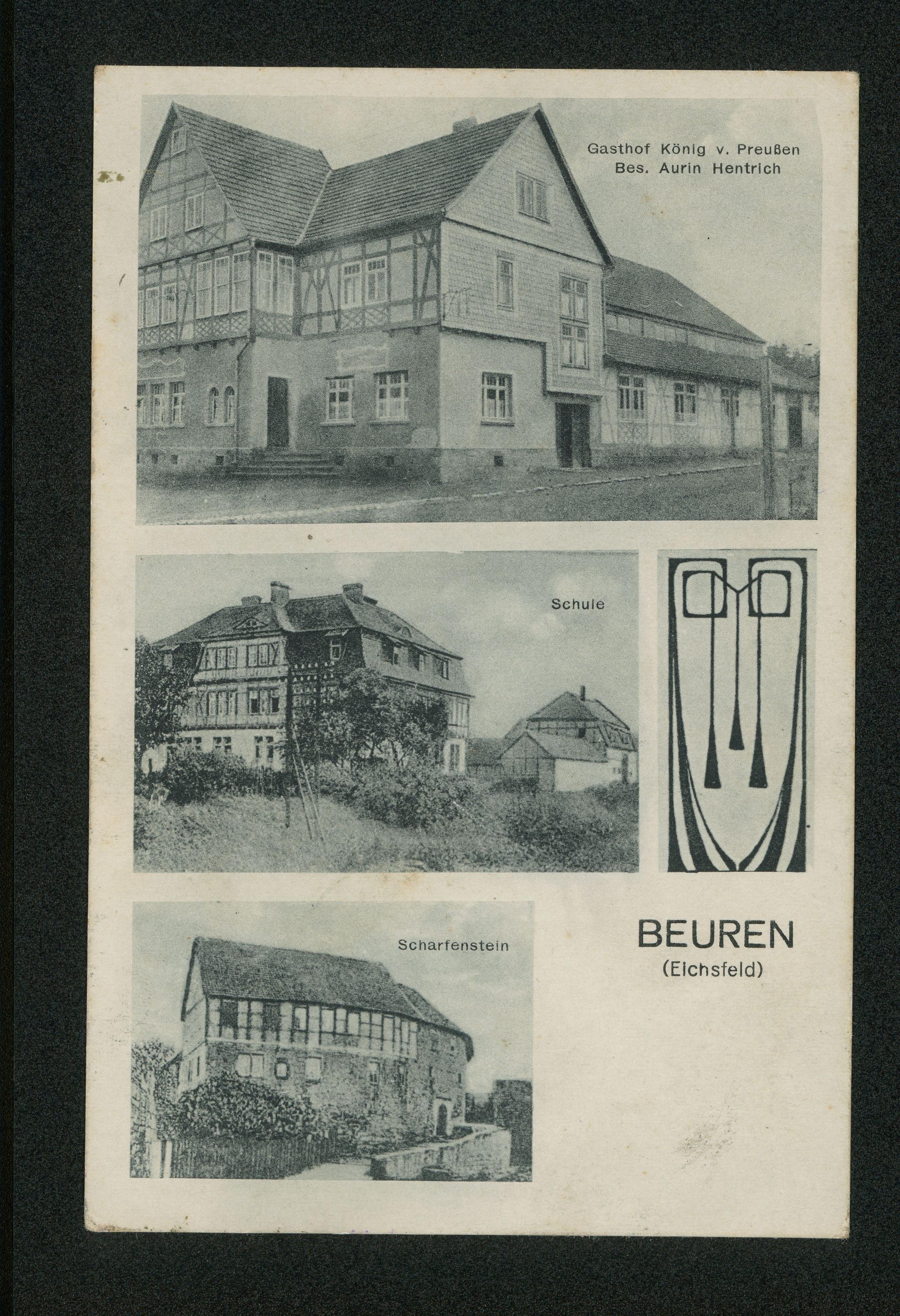 Ort Beuren Motive Gasthof König v. Preußen Bes. Aurin Hentrich Schule Scharfenstein Format klein Verlag Clemens Fick, Nordhausen Bestell- oder Individualnummer J 92 Tags Äußerer Burghof Burg Scharfenstein Gasthaus