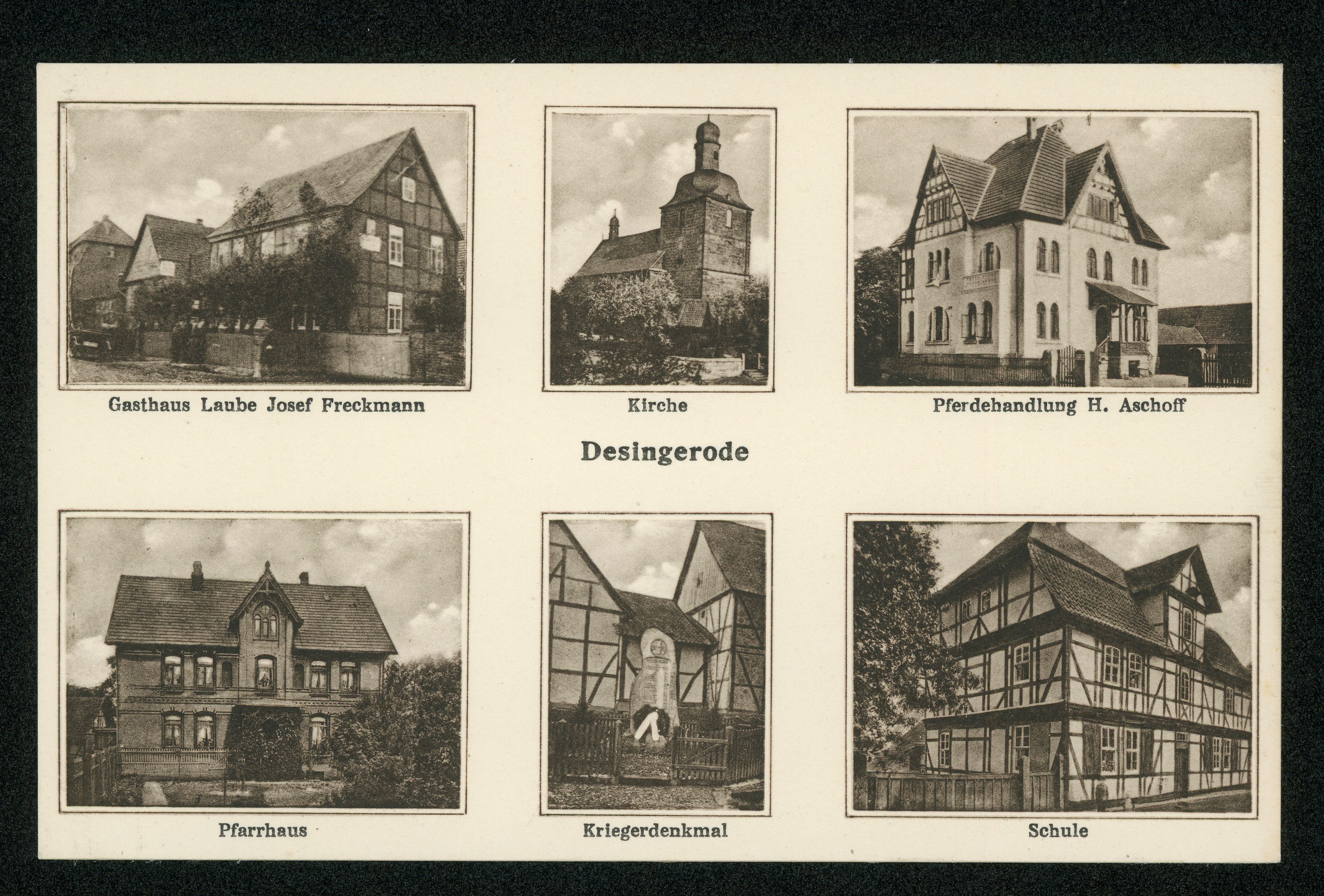 Ort Desingerode Beschreibung Sammlung: H.M.D. Motive Gasthaus Laube Josef Freckmann Kirche Pferdehandlung H. Aschoff Pfarrhaus Kriegerdenkmal Schule Format klein Verlag Aloys Mecke, Duderstadt Bestell- oder Individualnummer Nr. 208 6 Z Tags Gasthaus zur Laube