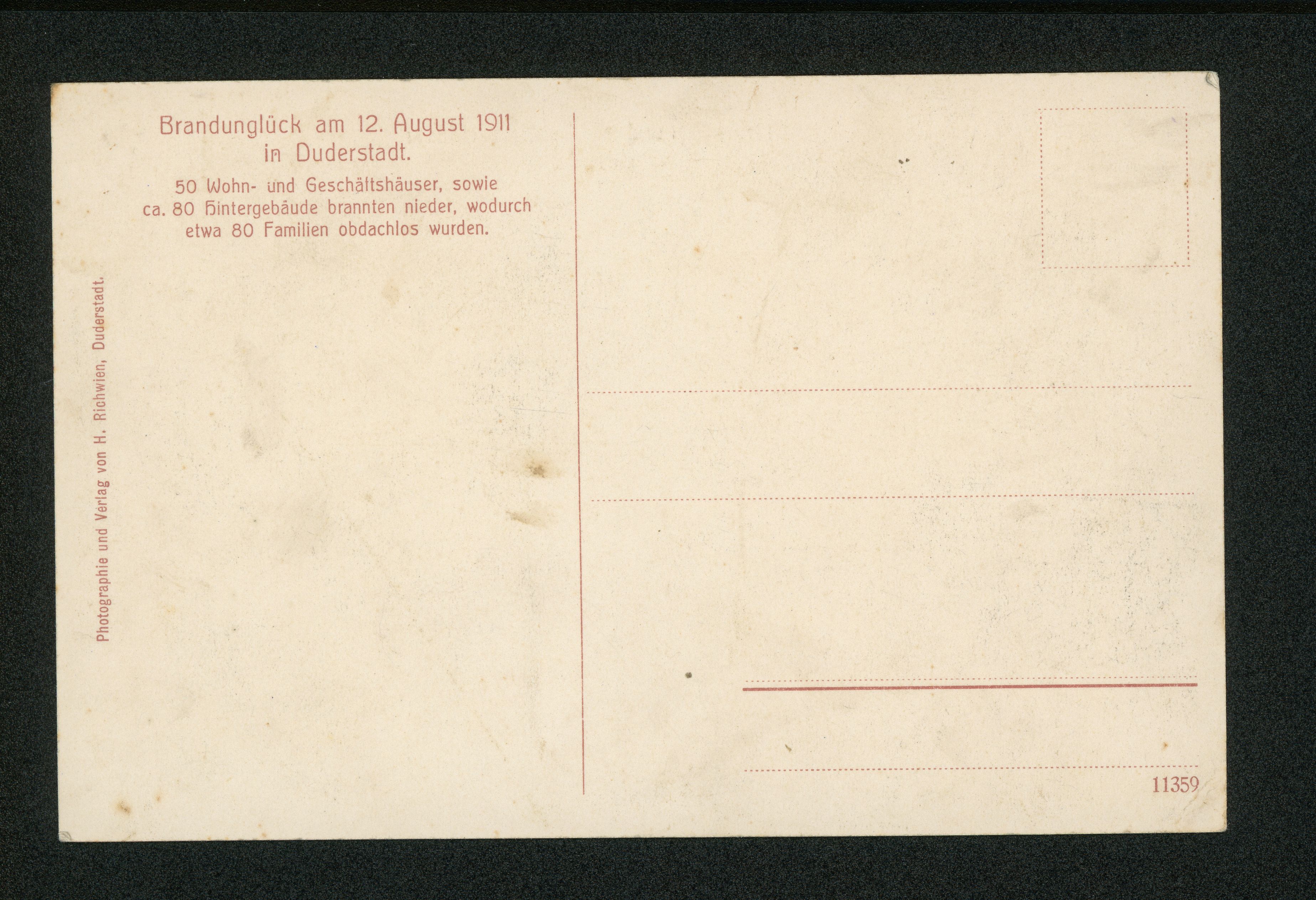 Ort Duderstadt Motive Brennende und eingestürzte Häuser am Markt Format klein Jahr 1911 Verlag H. Richwien, Duderstadt Bestell- oder Individualnummer 11359 Tags Gasthof zur Sonne Anton Deppe Gasthof zum Stern Joseph Lehne Westerturm Colonial & Porzellan Chr. Oberthür Dampfbäckerei & Conditorei Feuerwehr Pferdemarkt Unglück