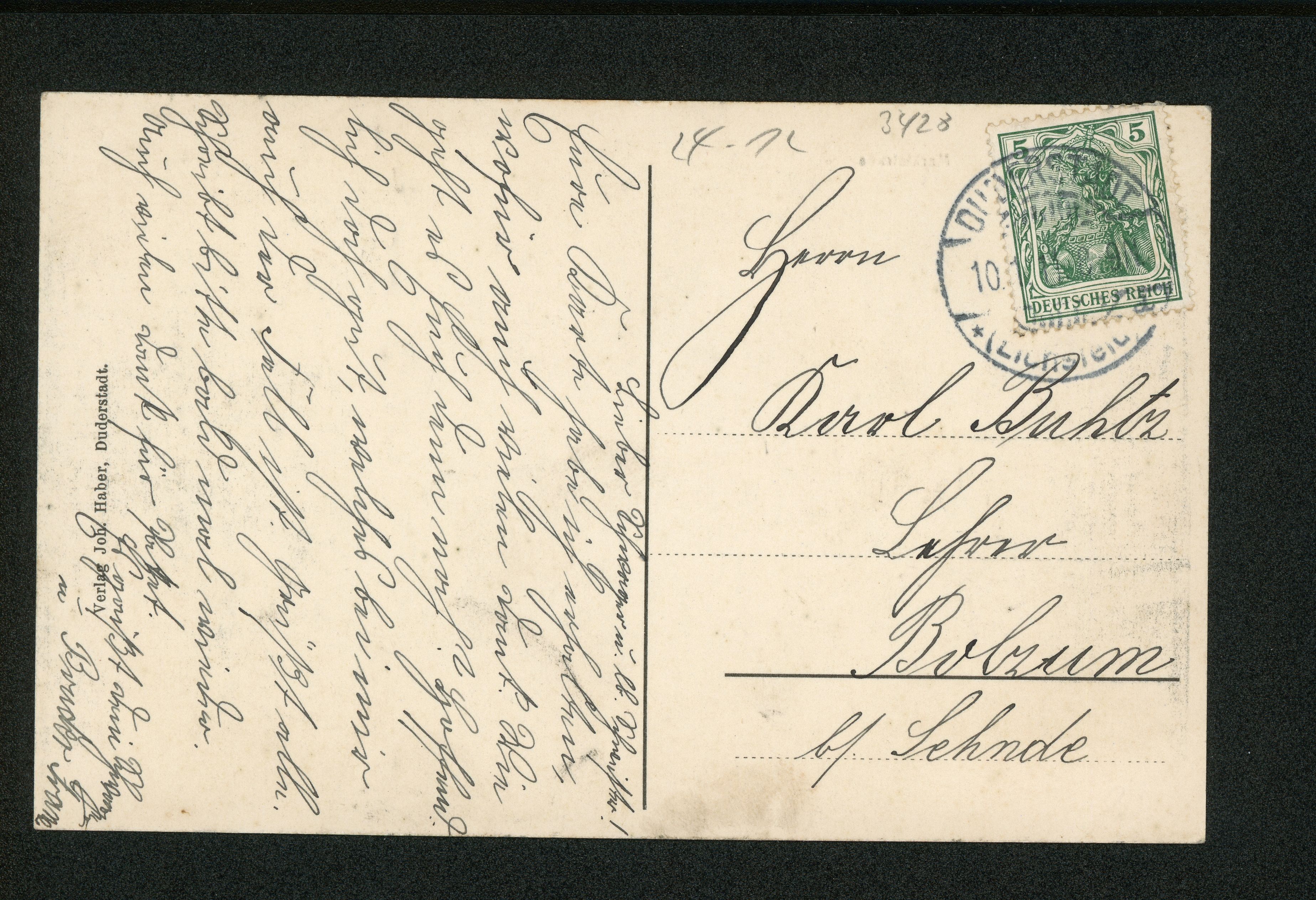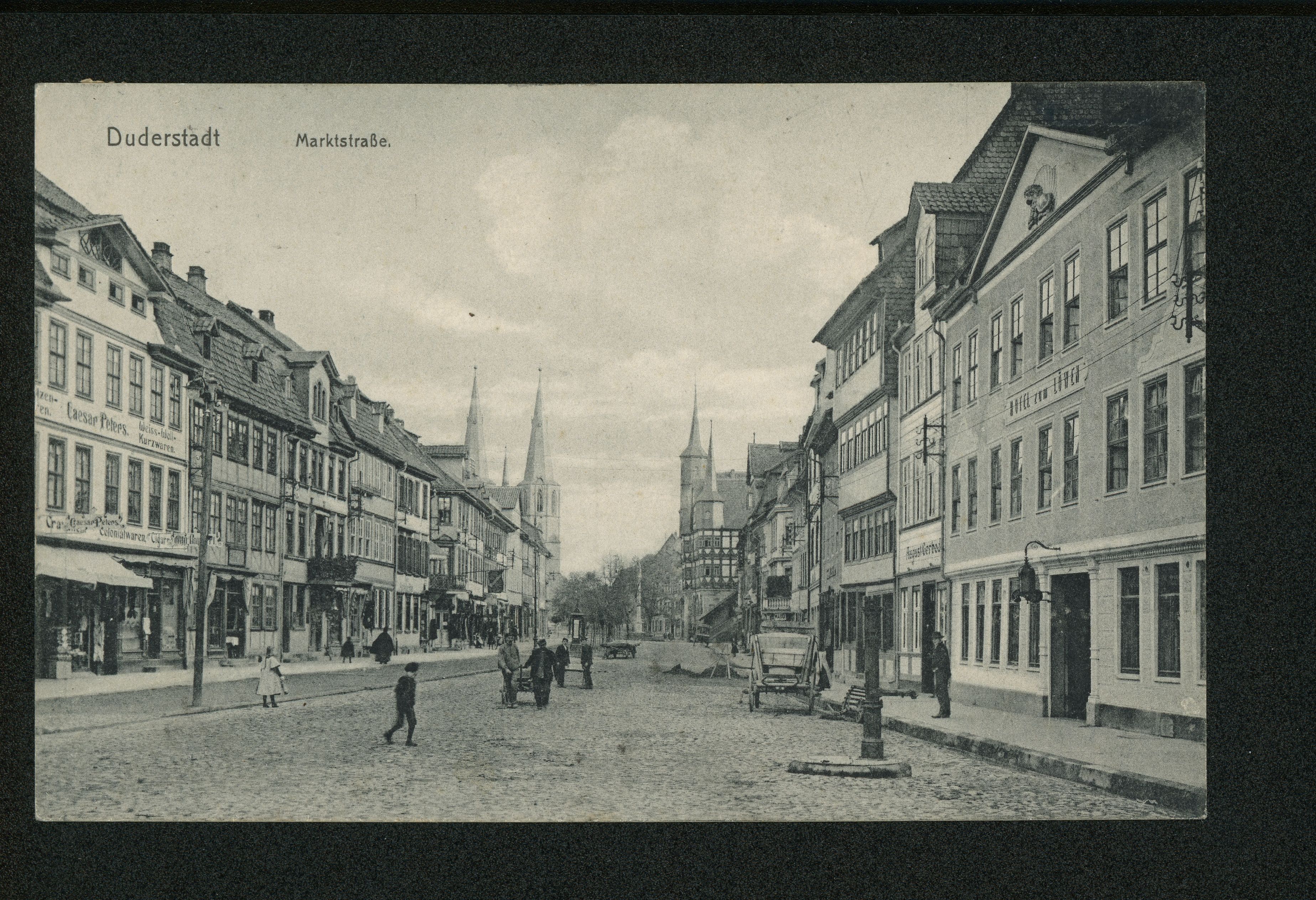 Ort Duderstadt Motive Marktstraße Format klein Jahr 1911 Verlag Johannes Haber, Duderstadt Bestell- oder Individualnummer - Tags Rathaus Geschäftshaus Hüte-Mützen-Pelzwaren Caesar Peters Hotel zum Löwen Leiterwagen St. Cyriakus