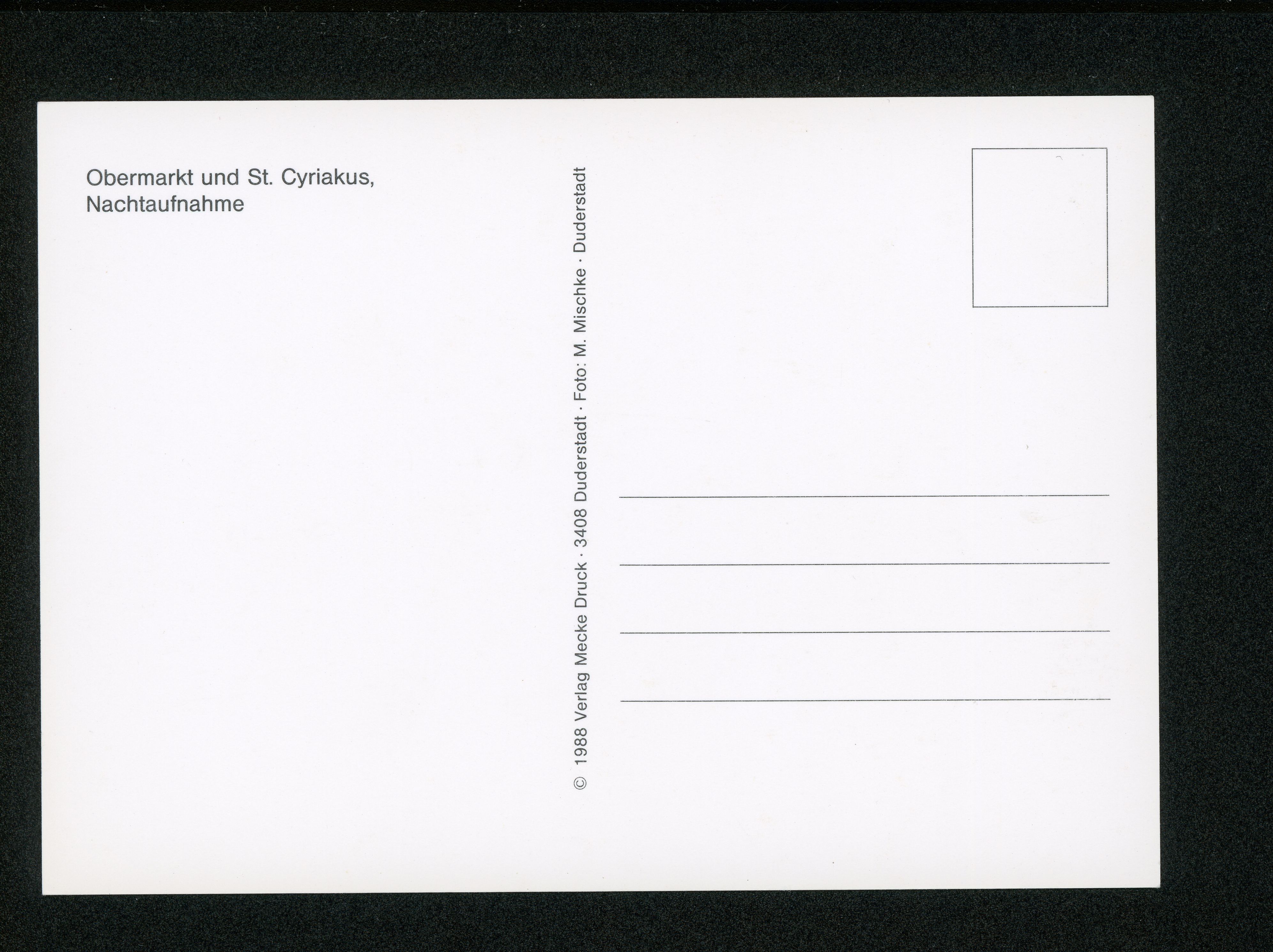 Ort Duderstadt Motive Obermarkt und St. Cyriakus, Nachtaufnahme Format groß Jahr 1988 Verlag Aloys Mecke, Duderstadt Bestell- oder Individualnummer - Tags Marktstraße