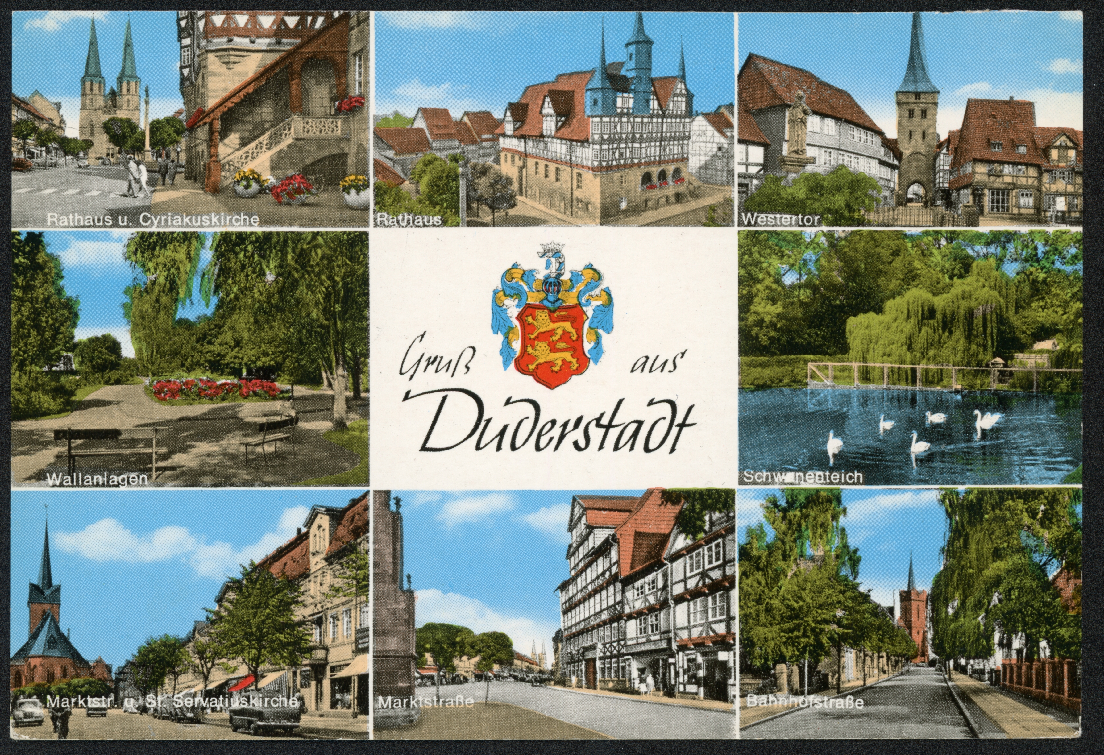 Ort Duderstadt Motive Rathaus u. Cyriakuskirche Rathaus Westertor Wallanlagen Schwanenteich Marktstr. u. St. Servatiuskirche Marktstraße Bahnhofstraße Format groß Verlag Chr. Schöning & Co., Lübeck (+ Gebrüder Schmidt) Bestell- oder Individualnummer dz Bestellnr. Dud 97 Tags Westerturm Hotel zur Tanne St. Servatius-Kirche Obertorteich