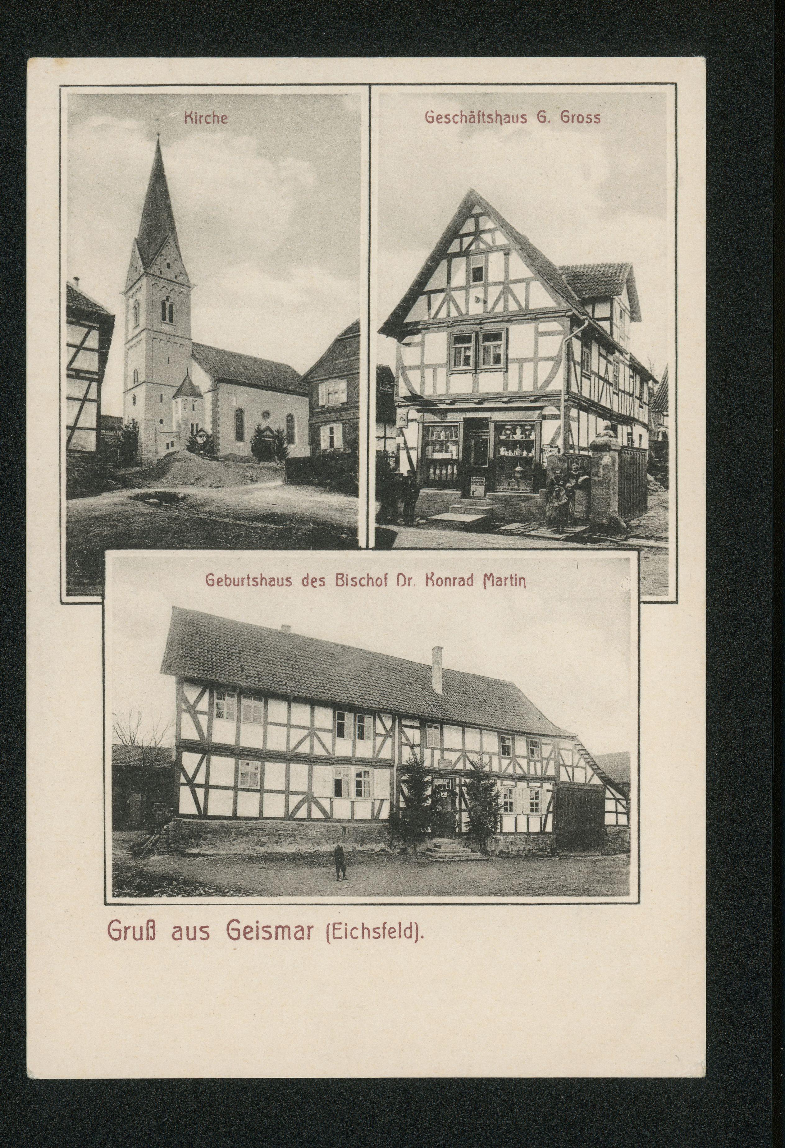 Ort Geismar Motive Kirche Geschäftshaus G. Gross Geburtshaus des Bischof Dr. Konrad Martin Format klein Jahr 1907 Verlag Rolf & Co., Hannover Bestell- oder Individualnummer 7172