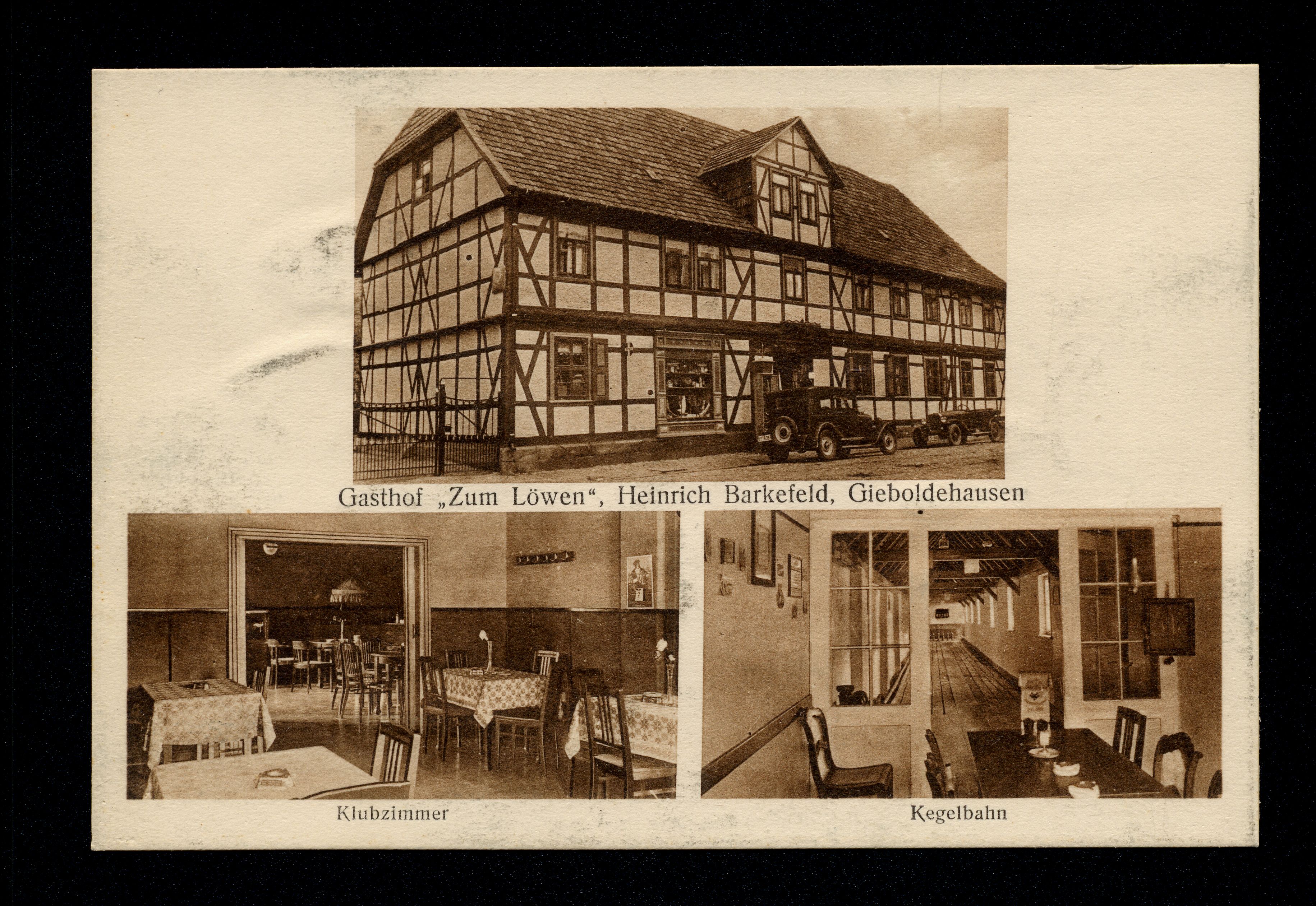 Ort Gieboldehausen Beschreibung Variante "braun" Motive Gasthof ''Zum Löwen'', Heinrich Barkefeld Klubzimmer Kegelbahn Format klein Verlag Aloys Mecke, Duderstadt Bestell- oder Individualnummer Nr. 403 d 85 Tags Gasthaus PKW Kegeln Bowling