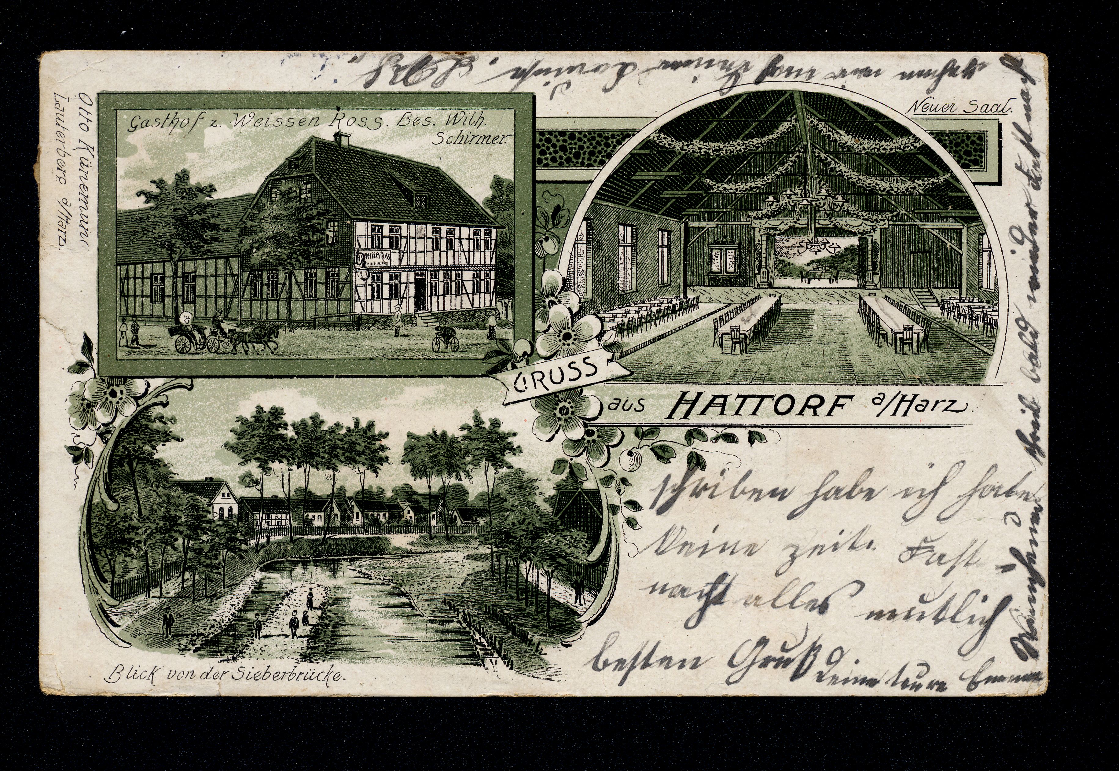 Ort Hattorf Motive Gasthof z. Weissen Ross. Bes. Wilh. Schirmer Neuer Saal Blick von der Sieberbrücke Format klein Verlag Otto Künemund, Lauterberg a/Harz Bestell- oder Individualnummer -