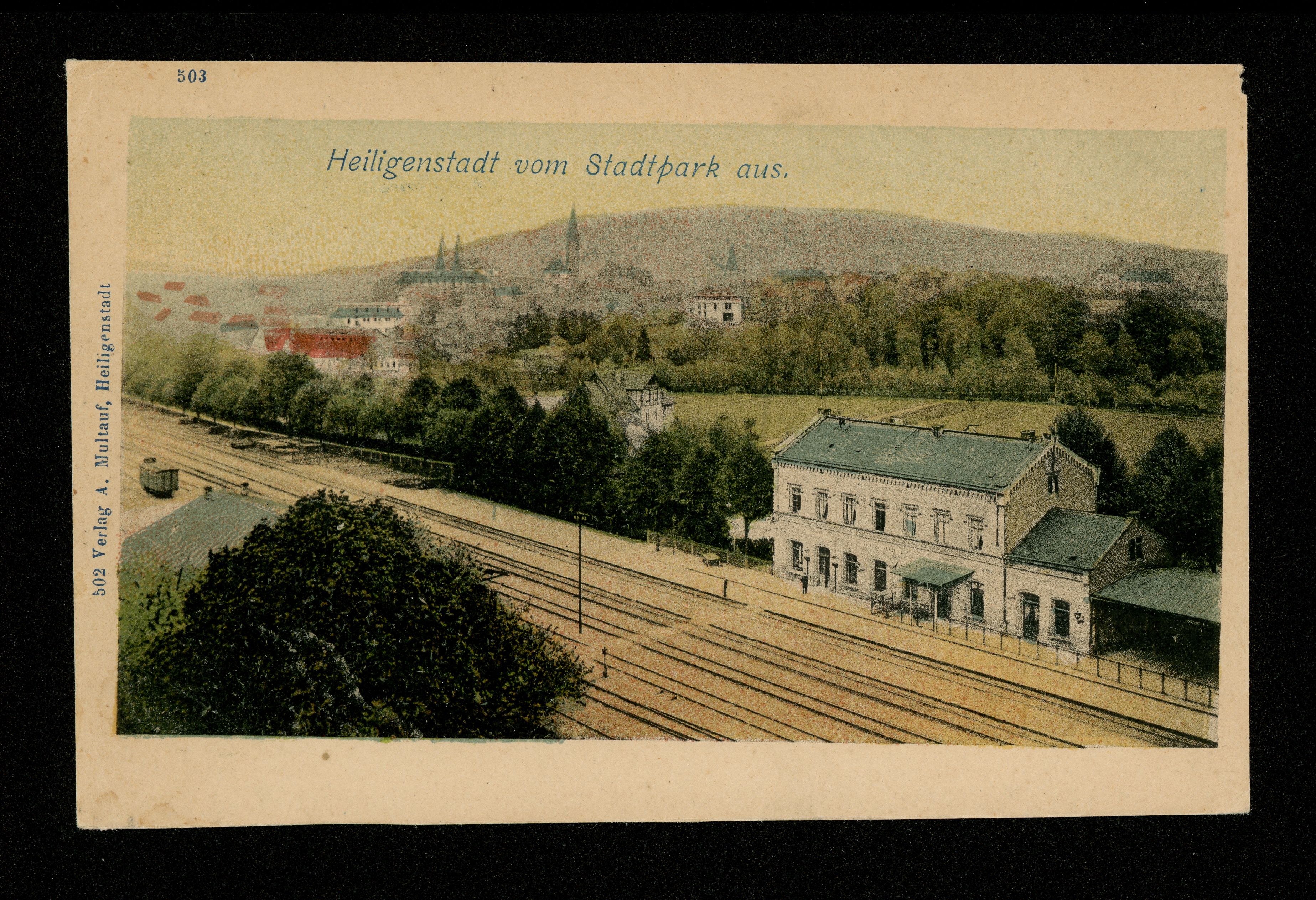 Ort Heiligenstadt Motive Heiligenstadt vom Stadtpark aus Format klein Verlag Albert Multhauf, Heiligenstadt Bestell- oder Individualnummer 502 503 Tags Bahnhof