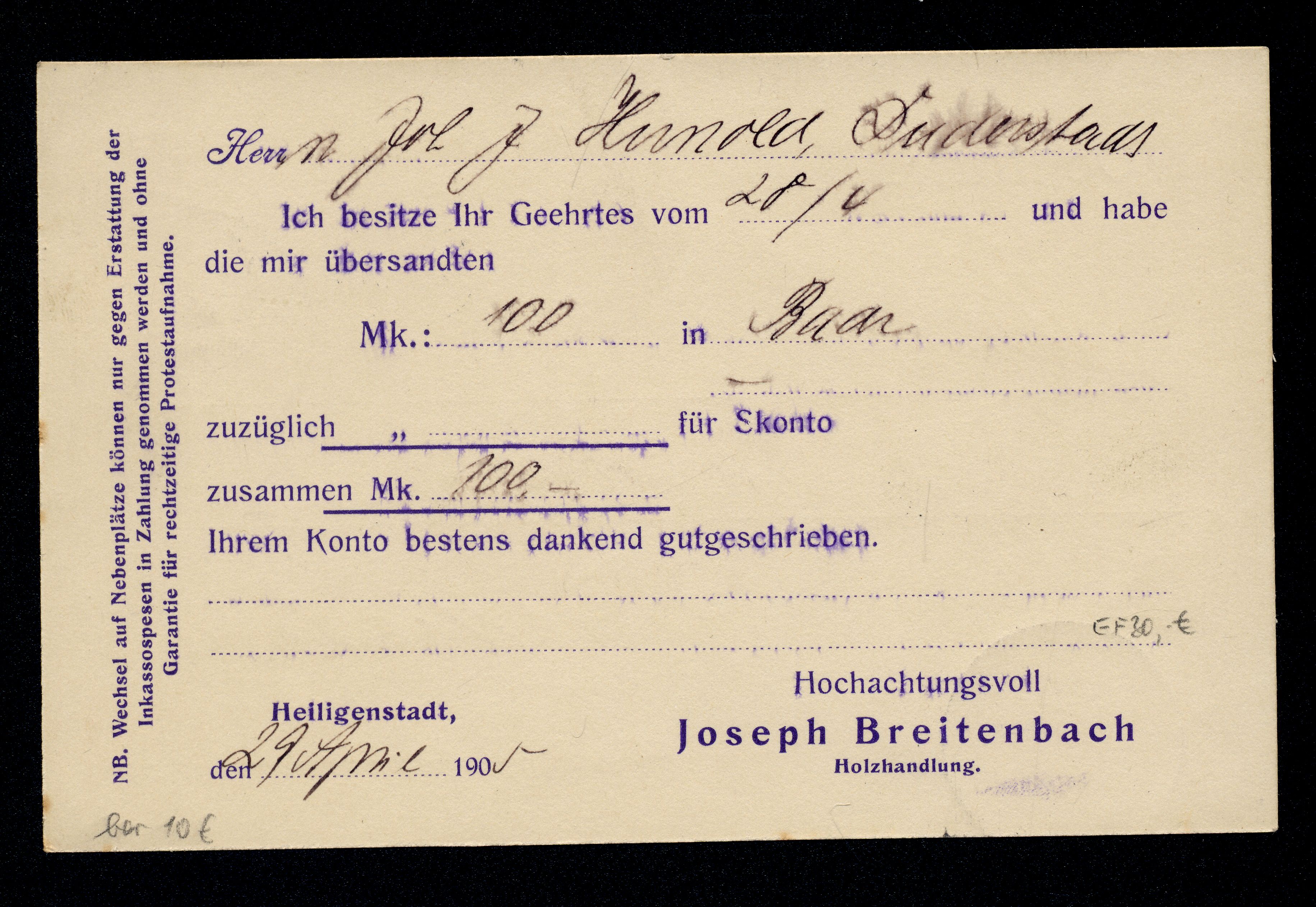Ort Heiligenstadt Motive Joseph Breitenbach, Holzhandlung Format klein Jahr 1905 Verlag - Bestell- oder Individualnummer - Versanddatum 29.04.1905