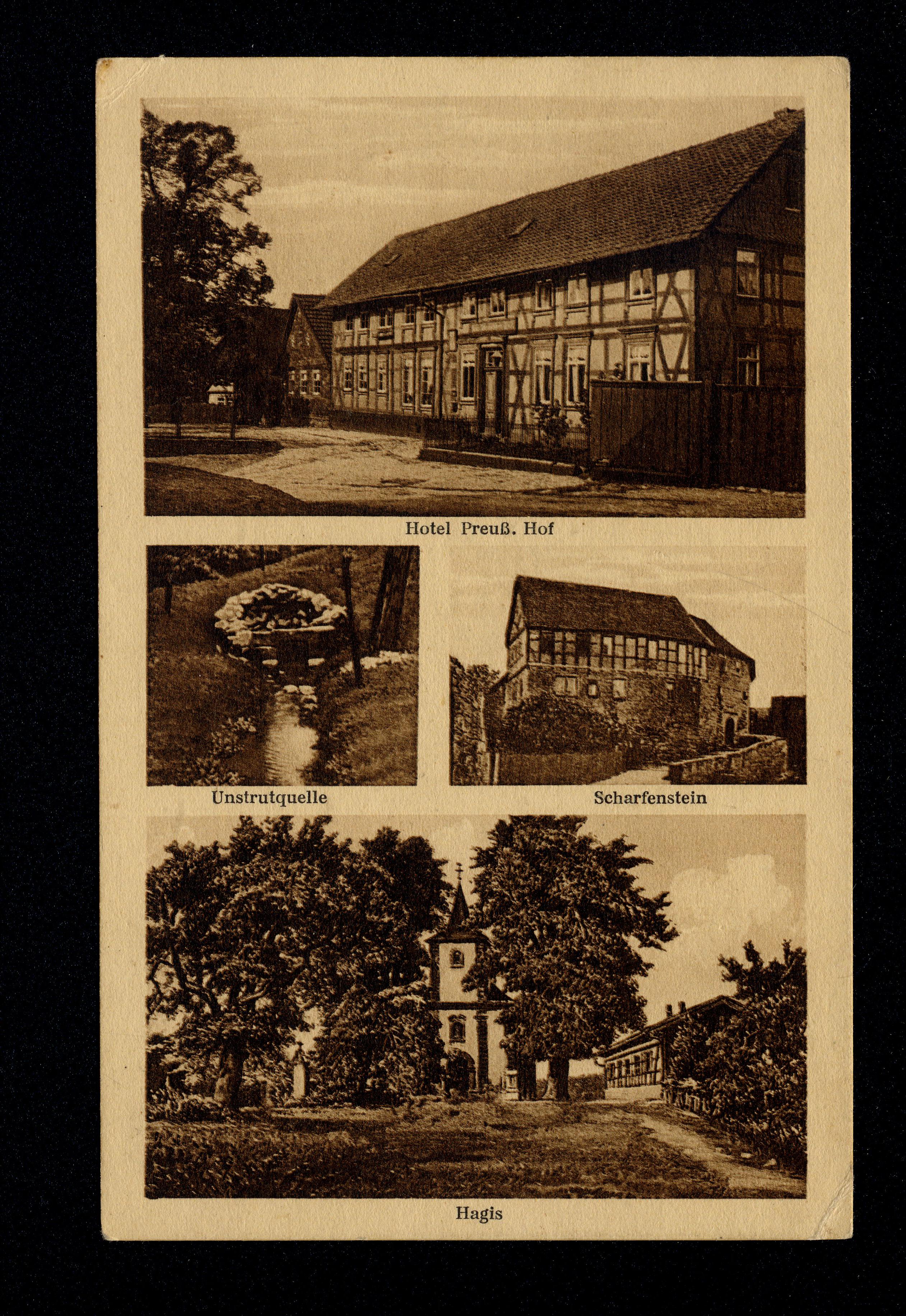 Ort Heuthen Motive Hotel Preuß. Hof Unstrutquelle Scharfenstein Hagis Format klein Verlag Clemens Fick, Nordhausen Bestell- oder Individualnummer S 2 Tags Kefferhausen Burg Scharfenstein Beuren Klüschen Hagis Wachstedt Hotel Preußischer Hof Besitzer Emil Jünemann