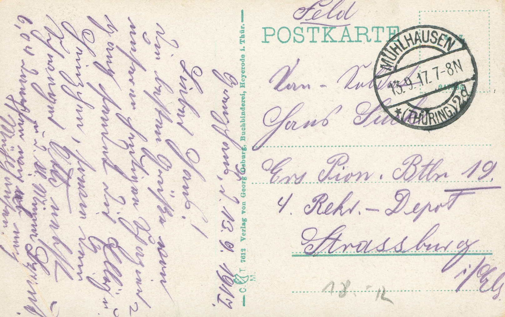 Ort Heyerode Beschreibung Sammlung: Oliver KrebsStandort: Gemeindearchiv Lengenfeld unterm Stein Motive Kurhaus Format klein Jahr 1917 Verlag Georg Osburg, Heyerode i. Thür. Bestell- oder Individualnummer 7612 6 17. 247 unleserlich 5 Versanddatum 13.09.1917 Tags Gasthaus Feldpost Grenzhaus