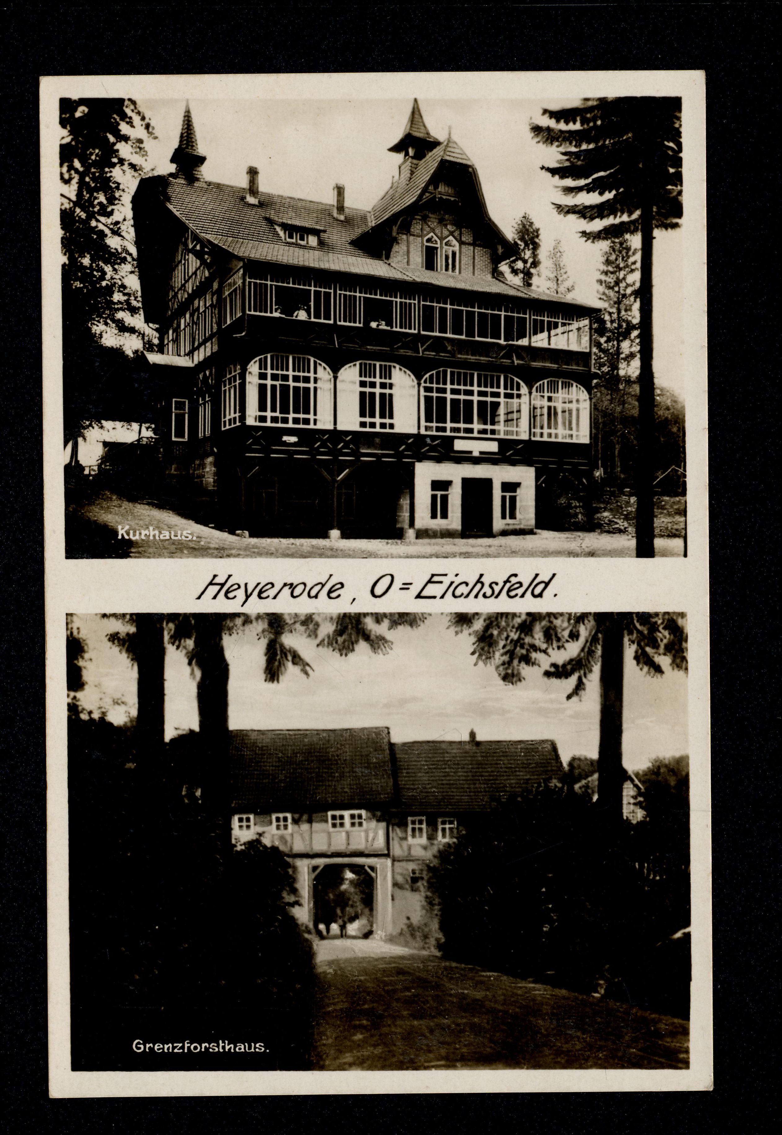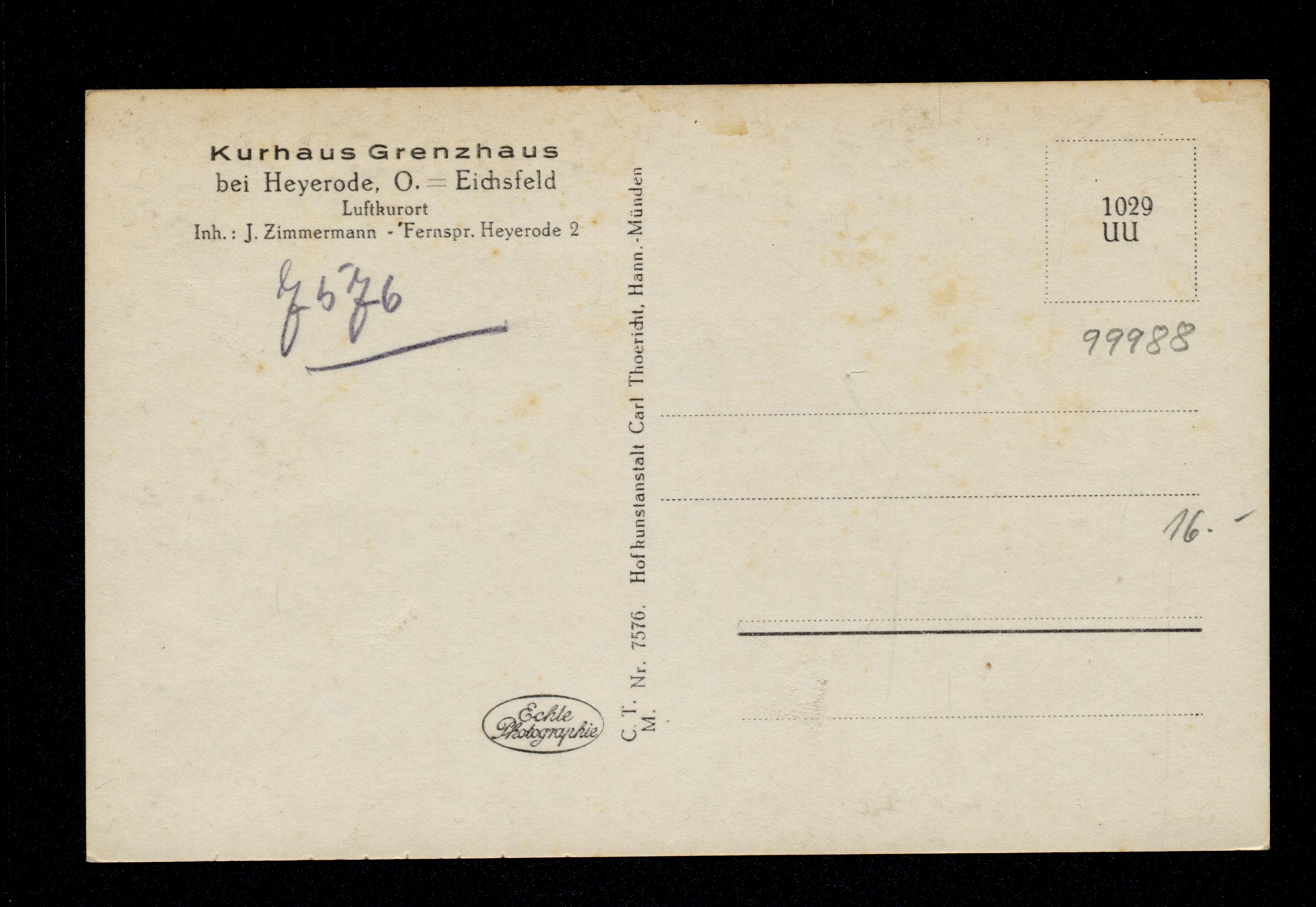 Ort Heyerode Motive Kurhaus Grenzforsthaus Format klein Verlag Carl Thoericht, Hann.-Münden (Karl Thoericht) (CTM) Bestell- oder Individualnummer 7576 1029 UU Tags Kurhaus Grenzhaus Inh.: J. Zimmermann Gasthaus