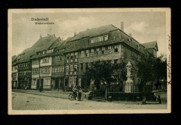 Teilansicht, Gemischtwarenhandlung Robert Meyer, Ev. Kirche St. Cosmas und Damian |