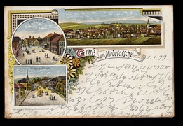 Spiegelbrücke mit Westerthurm, Ursulinen-Kloster, Bahnhofstr. m. evang. Kirche, Rathhaus, Panorama, Kath. Probstei-Kirche mit Schule |