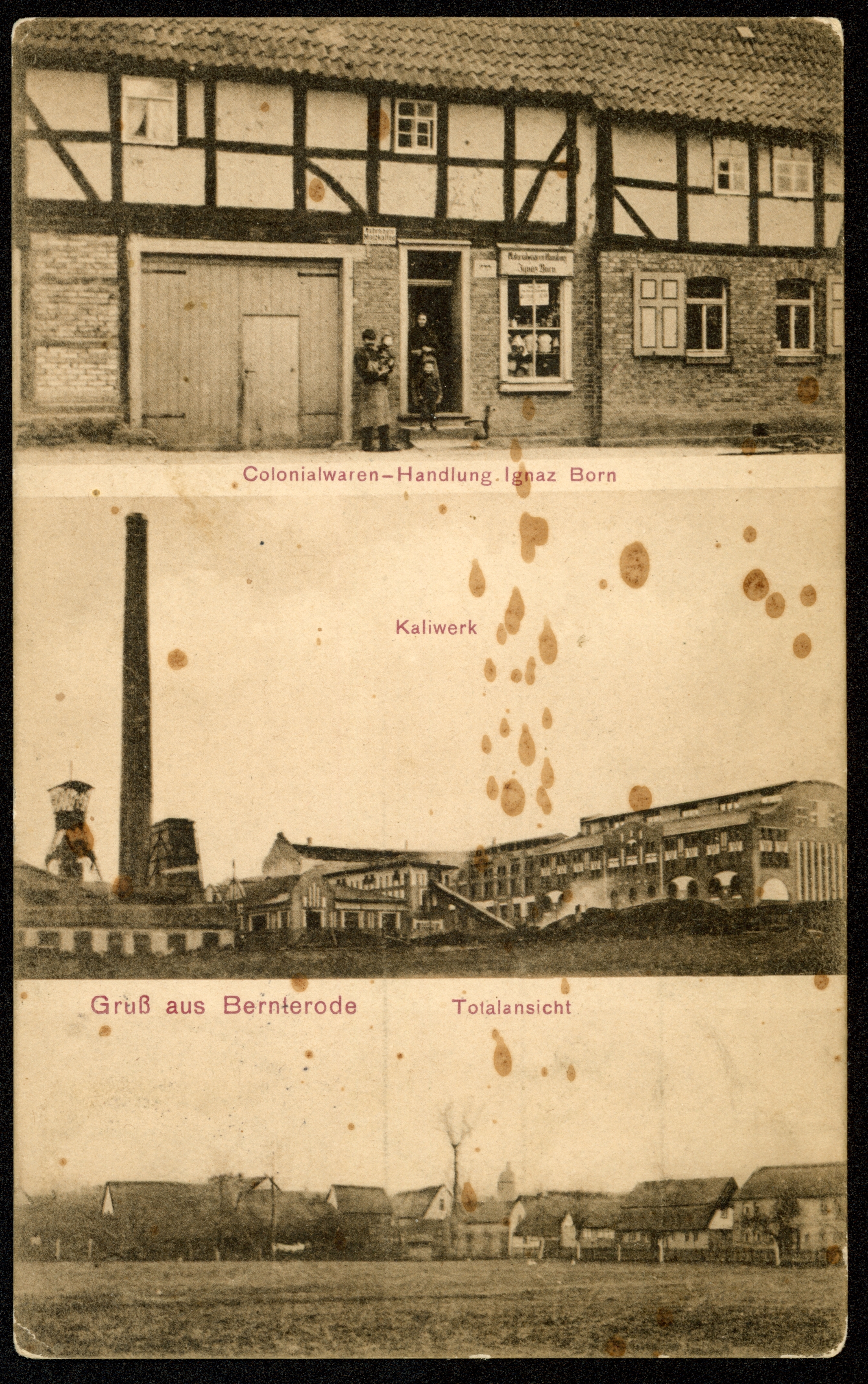 Ort Bernterode (Breitenworbis) Motive Colonialwaren-Handlung Ignaz Born Kaliwerk Totalansicht Format klein Jahr 1909 Verlag R. Michaelis, Nordhausen Bestell- oder Individualnummer 3364 Versanddatum 21.09.1909 Tags Kolonialwaren Kaliwerk Bernterode-Schacht Kalibergbau