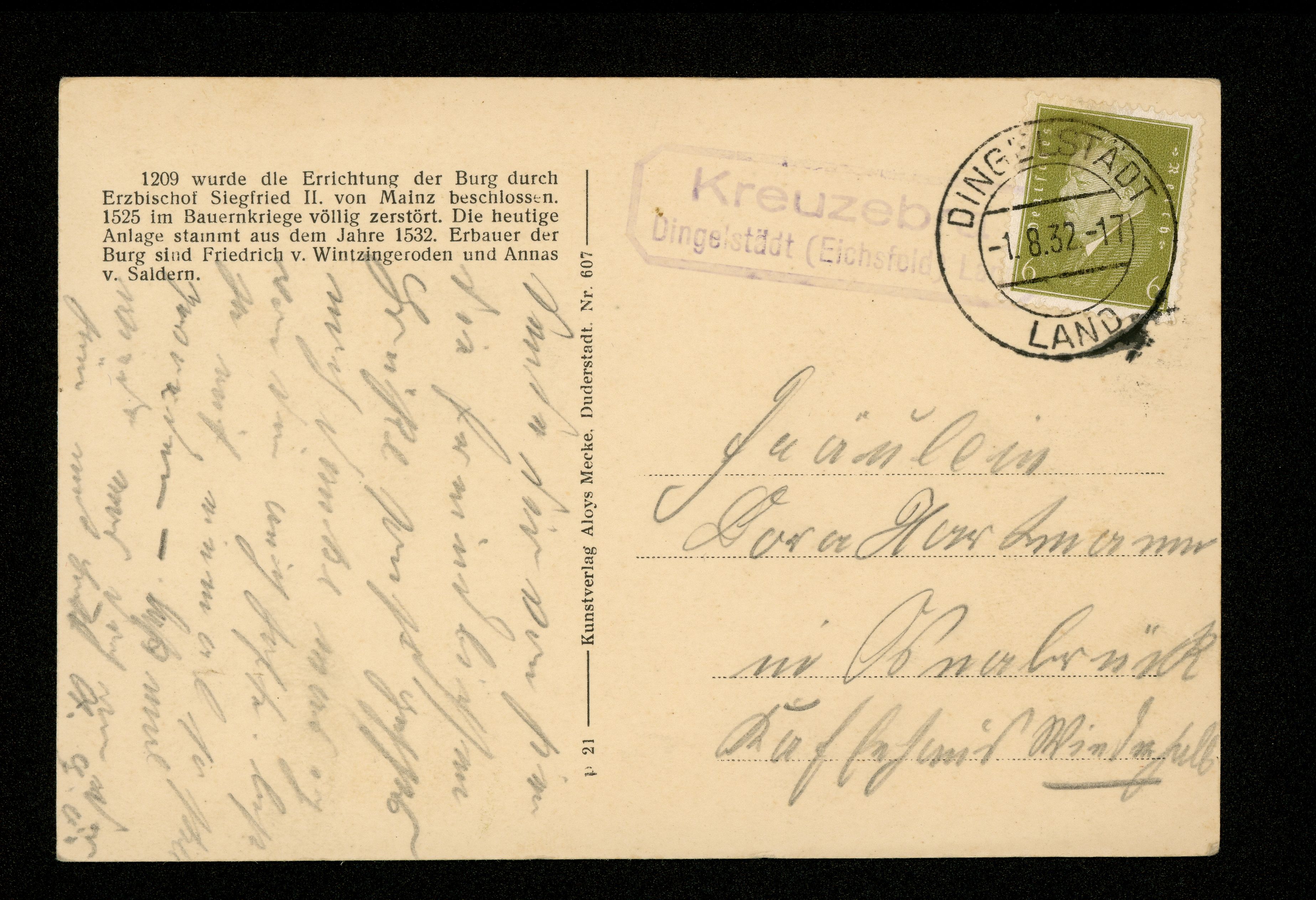 Ort Beuren Beschreibung Variante "blau" Motive Panorama Format klein Jahr 1932 Verlag Aloys Mecke, Duderstadt Bestell- oder Individualnummer Nr. 607 p 21 Versanddatum 01.08.1932 Tags Landpoststempel Kreuzebra