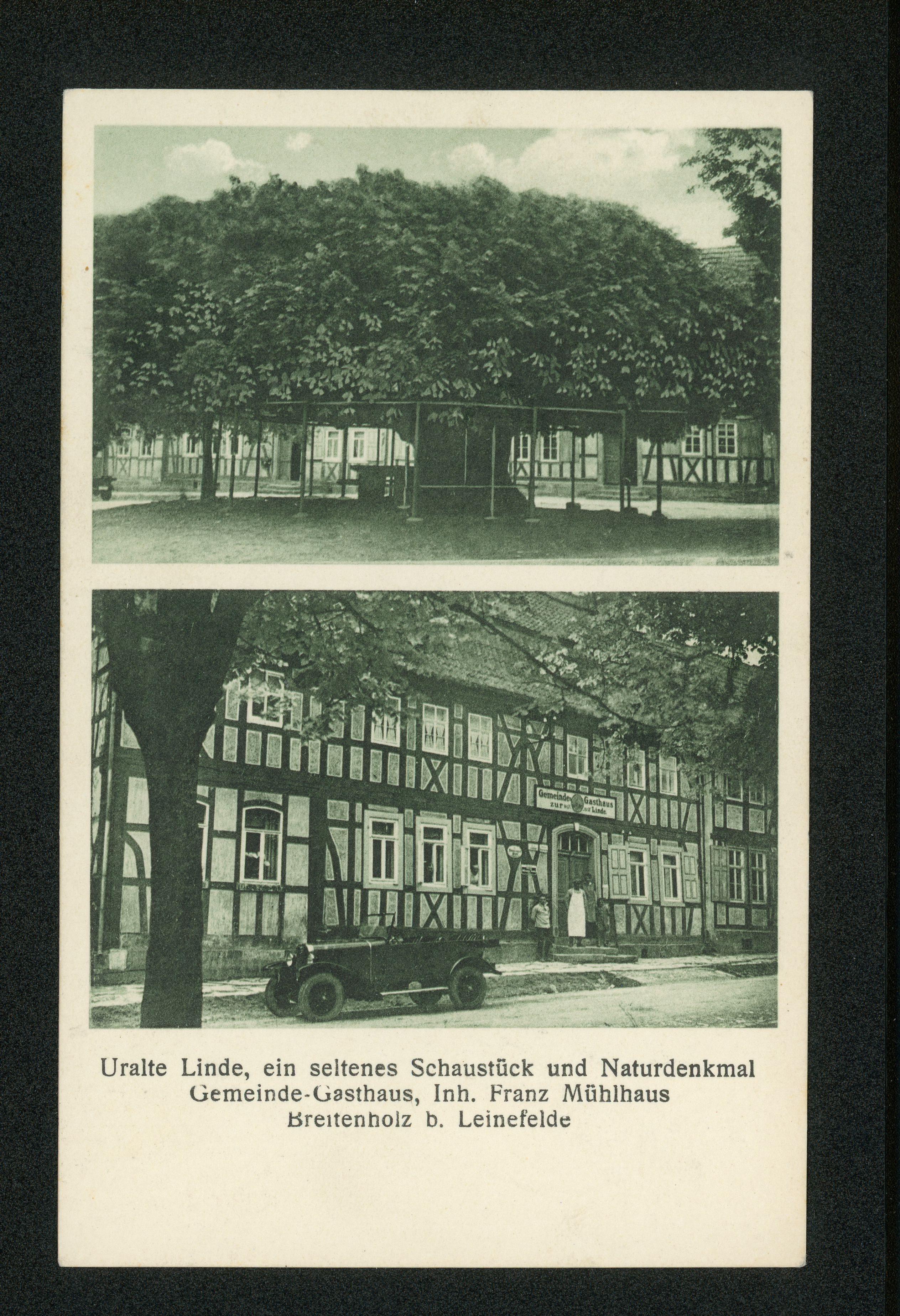 Ort Breitenholz Motive Uralte Linde Gemeinde=Gasthaus zur Linde, Inh. Franz Mühlhaus Format klein Verlag Aloys Mecke, Duderstadt Bestell- oder Individualnummer Nr. 171 8 x Tags PKW Zur Linde Landpoststempel