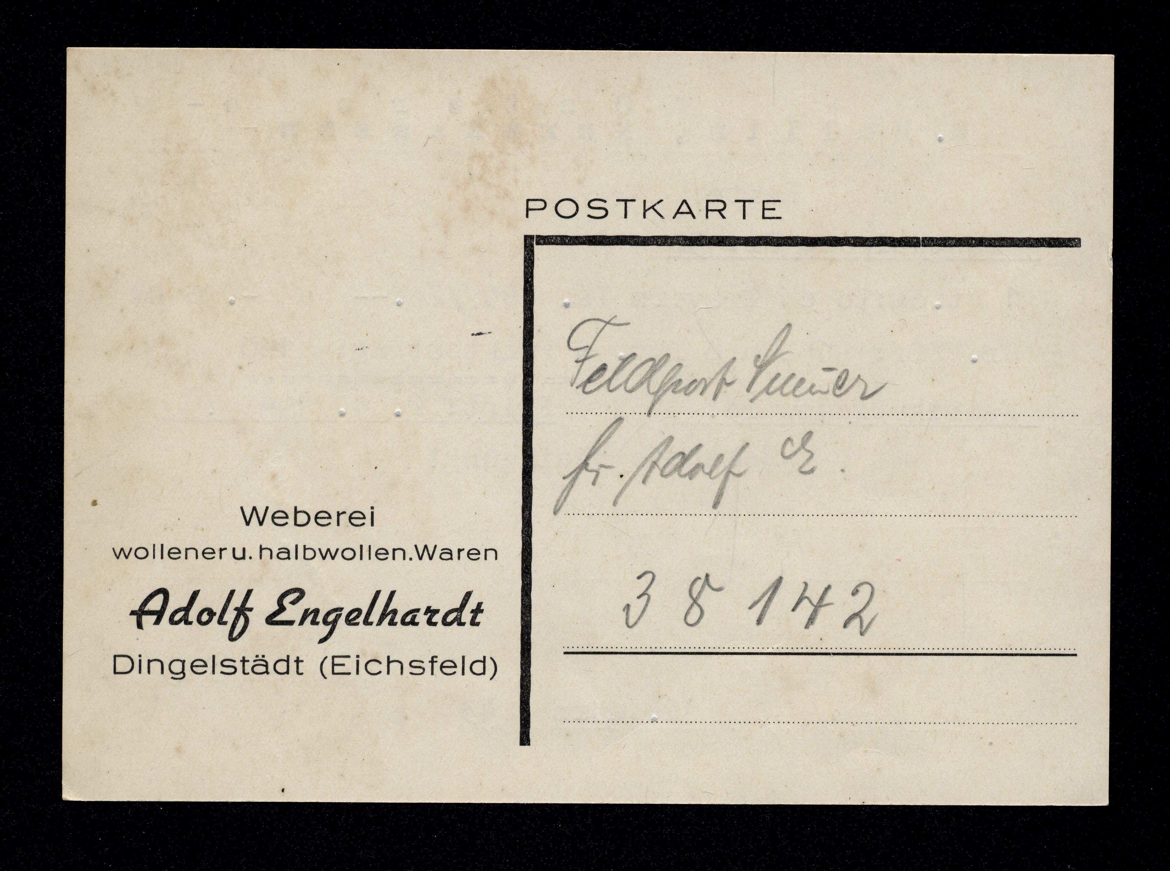 Ort Dingelstädt Motive Weberei wollener u. halbwollen. Waren Adolf Engelhardt Format groß Jahr 1943 Verlag - Bestell- oder Individualnummer - Versanddatum 18.03.1943