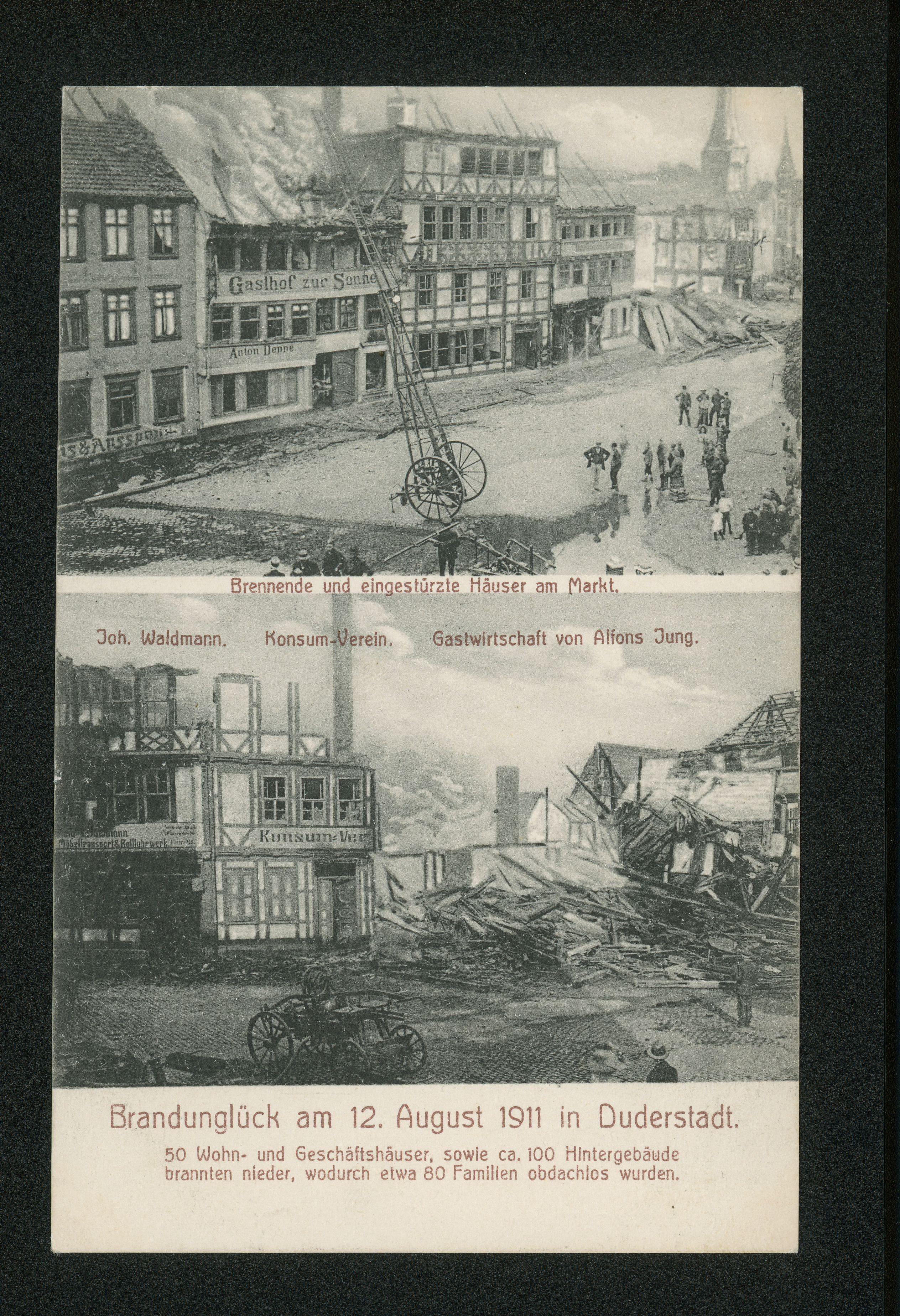 Ort Duderstadt Motive Brennende und eingestürzte Häuser am Markt Joh. Waldmann Konsum-Verein Gastwirtschaft von Alfons Jung Format klein Jahr 1911 Verlag H. Richwien, Duderstadt Bestell- oder Individualnummer 11466 Tags Unglück Gasthaus Feuerwehr Konsumverein Ludwig Waldmann, Spedition Möbeltransport & Rollfuhrwerk Konsumgenossenschaft Gasthof zur Sonne Anton Deppe Gasthof zum Stern Joseph Lehne Westerturm Colonial & Porzellan Chr. Oberthür Dampfbäckerei & Conditorei Pferdemarkt