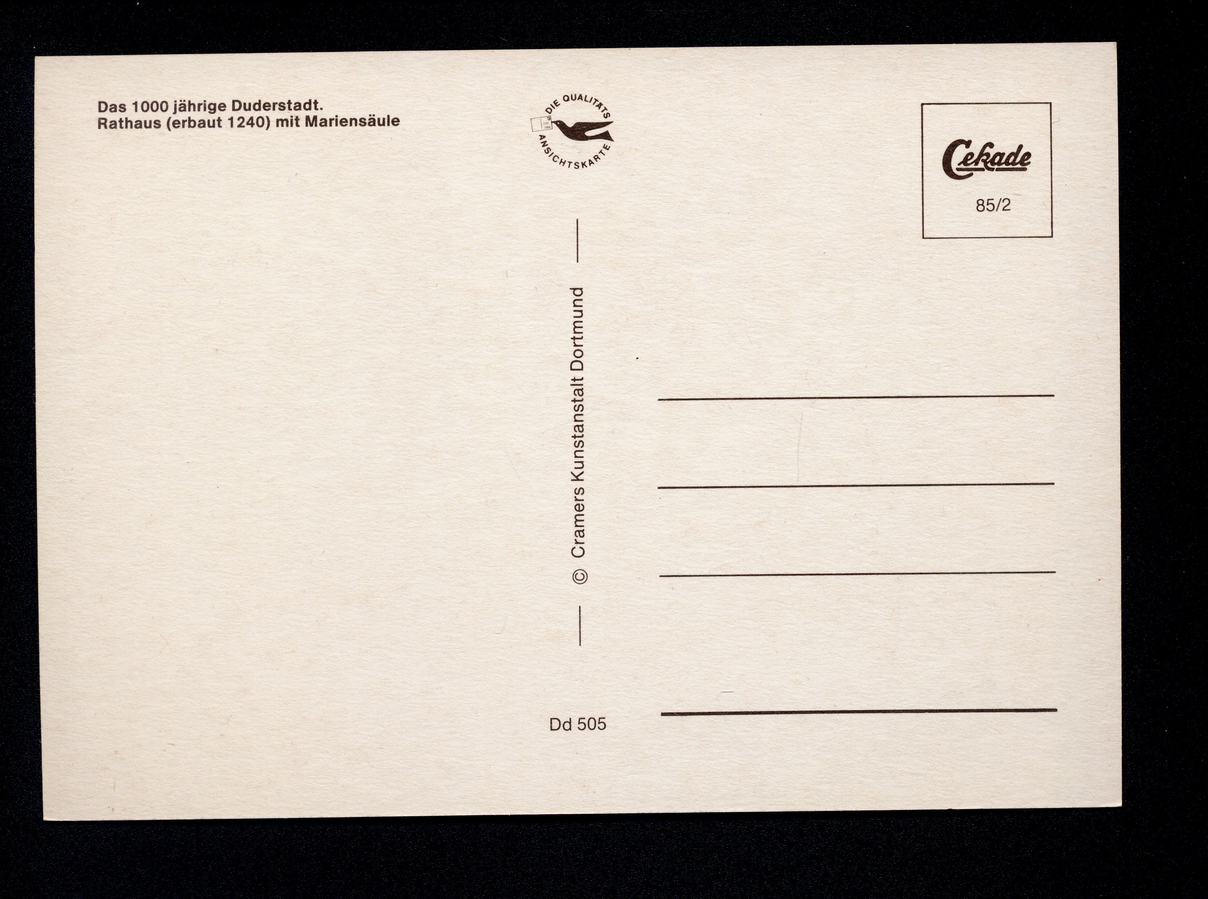 Ort Duderstadt Motive Rathaus ''erbaut 1240'' mit Mariensäule Format groß Jahr 1985 Verlag Cramers Kunstanstalt, Dortmund Bestell- oder Individualnummer Dd 505 85/2