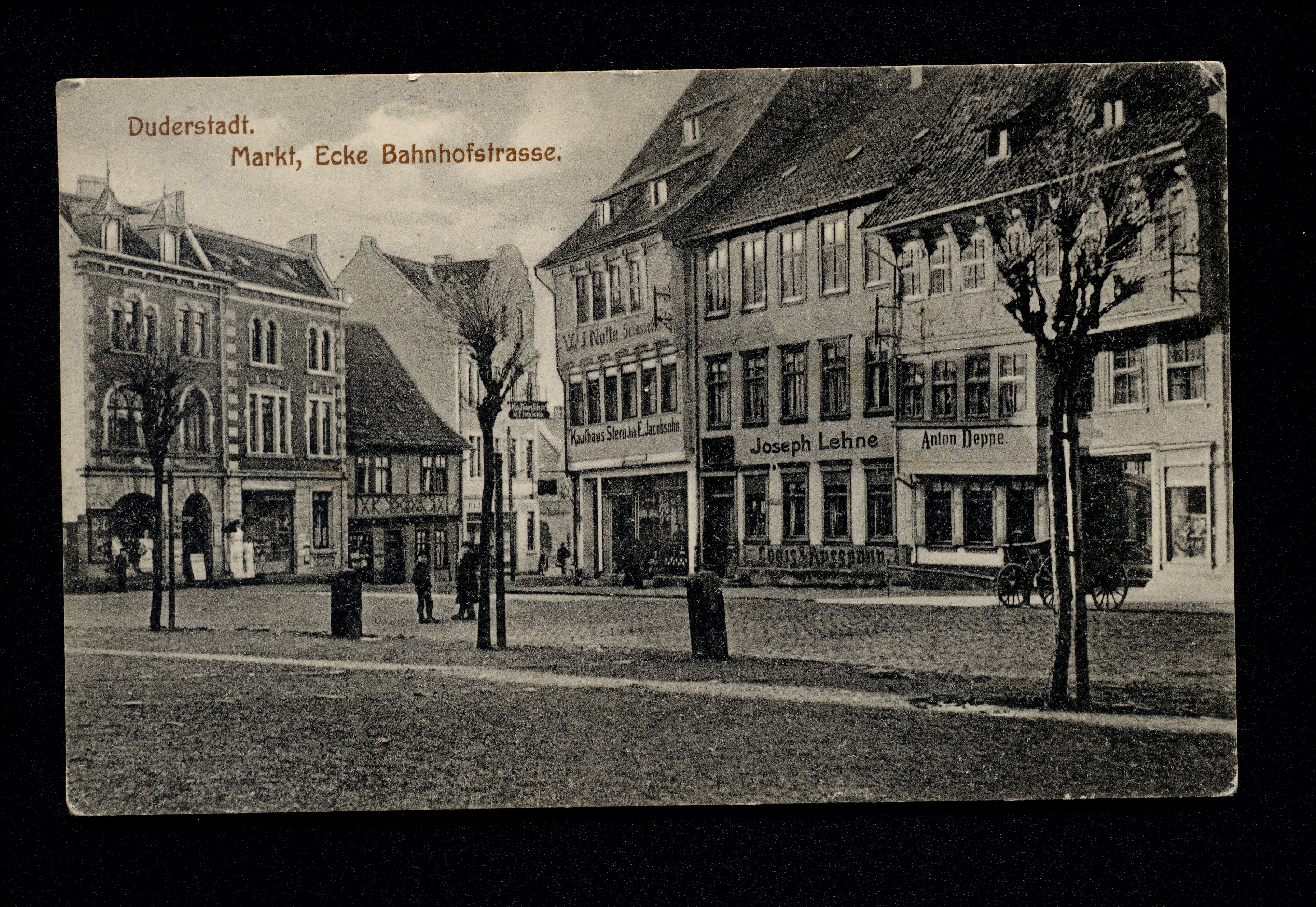Ort Duderstadt Motive Markt, Ecke Bahnhofstraße Format klein Verlag Aloys Mecke, Duderstadt Bestell- oder Individualnummer - Tags Gasthof zum Stern Joseph Lehne Gasthof zur Sonne Anton Deppe Kaufhaus Stern Inh. E. Jacobsohn