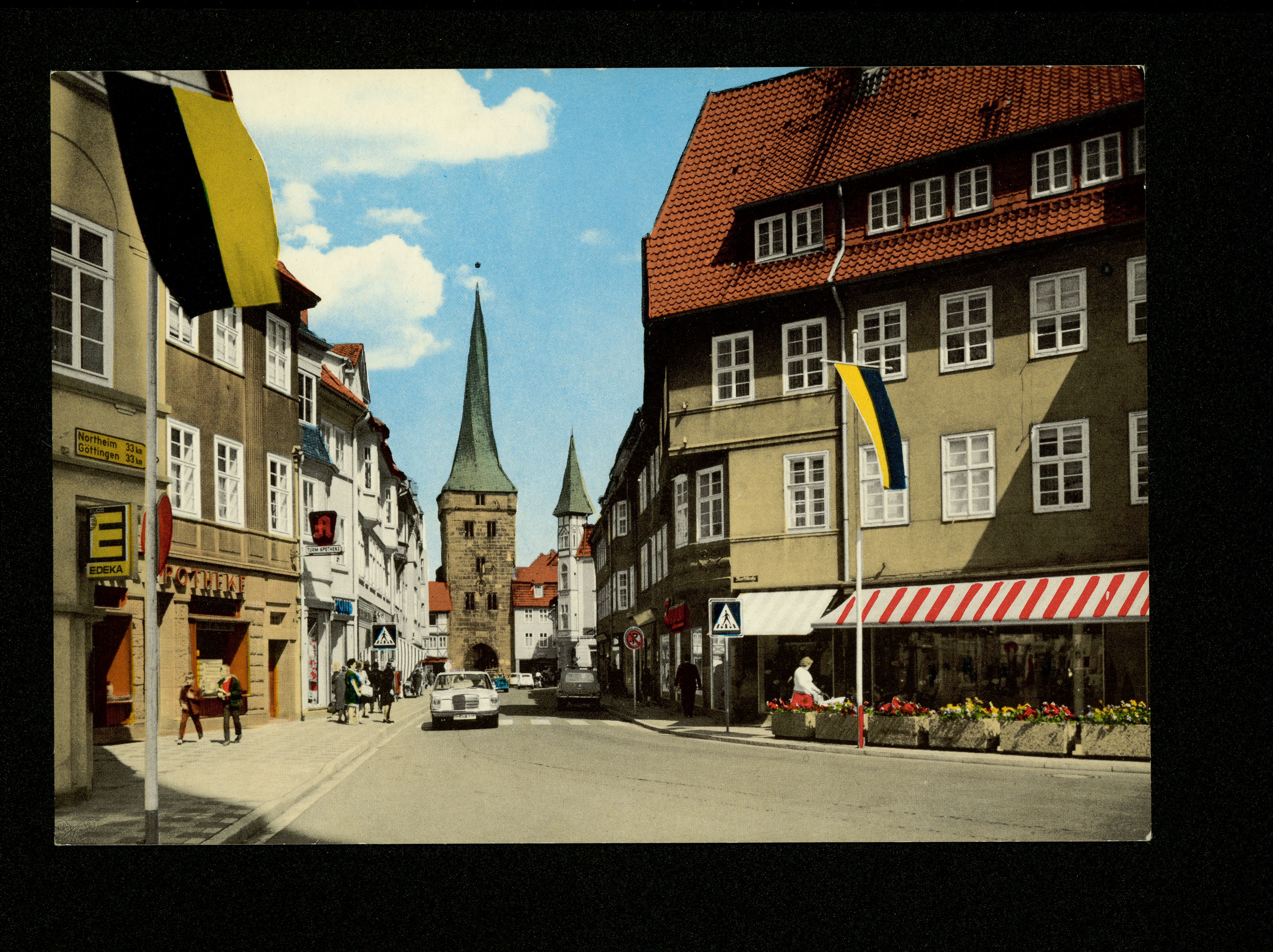 Ort Duderstadt Motive Westerturm mit Spiegelbrücke Format groß Verlag Chr. Schöning & Co., Lübeck (+ Gebrüder Schmidt) Bestell- oder Individualnummer ns Bestellnr. Dud 112 Tags Edeka Apotheke