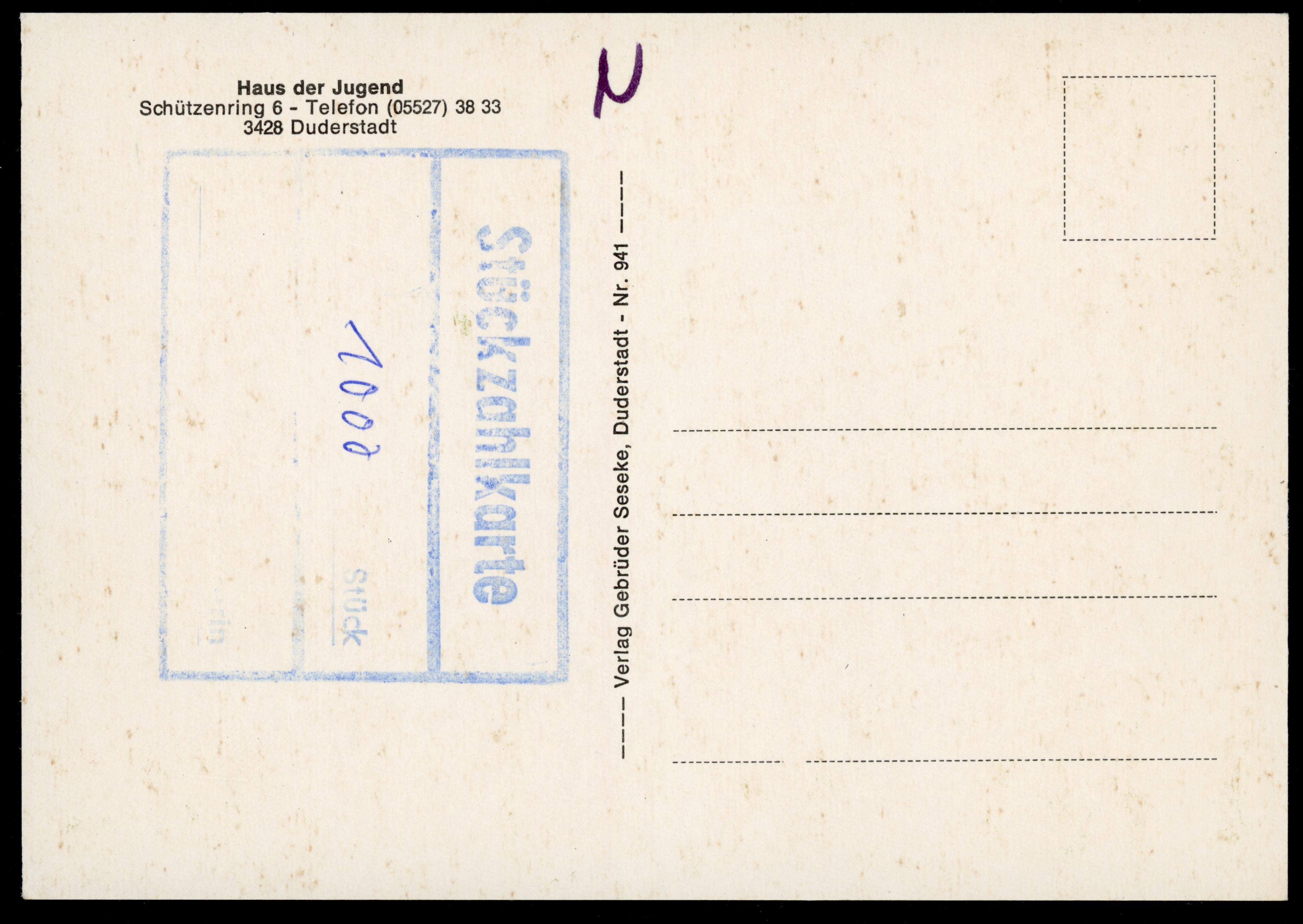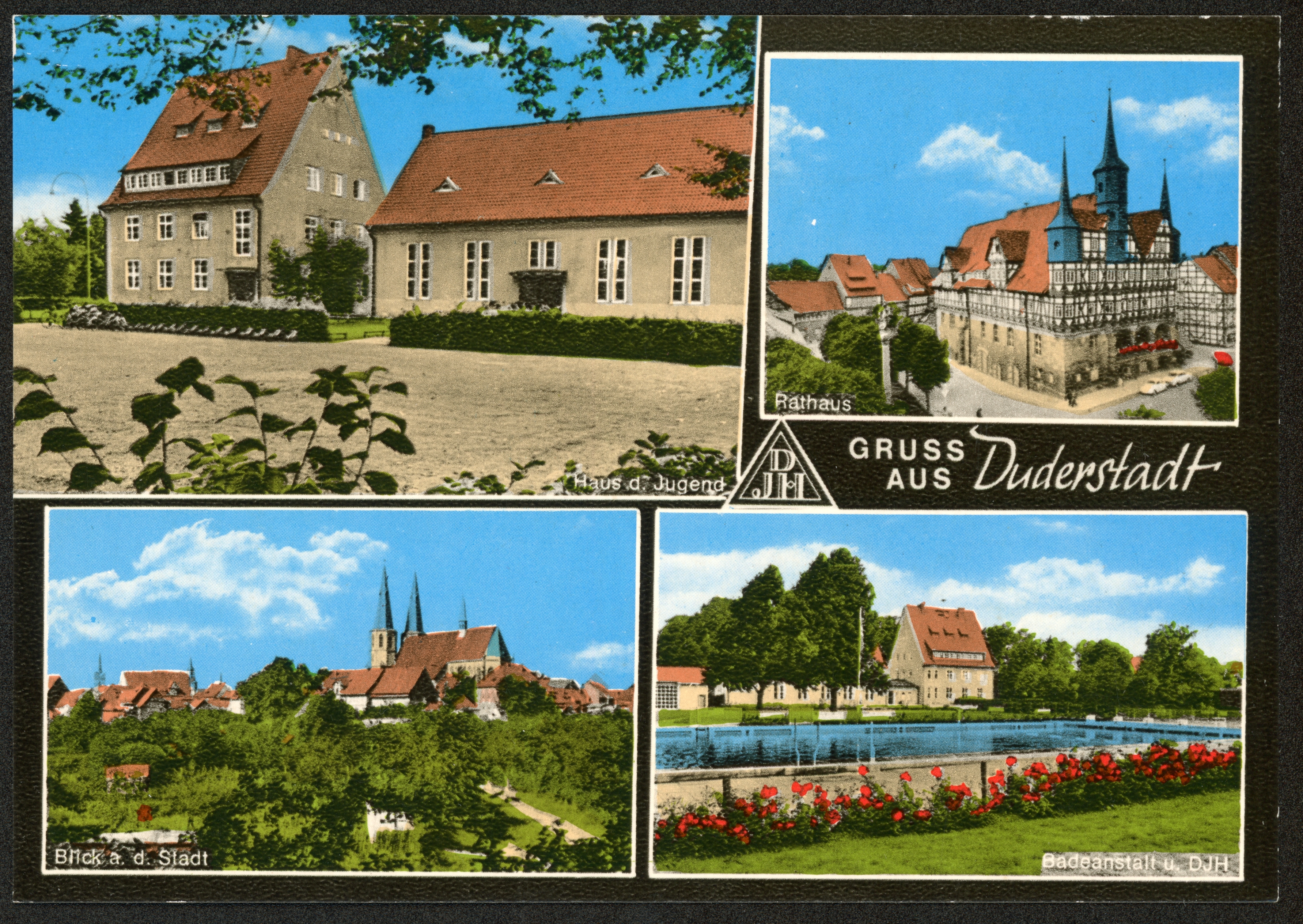 Ort Duderstadt Beschreibung Variante "Rückseite" Motive Haus d. Jugend Blick a.d. Stadt Rathaus Badeanstalt u. DJH Format groß Verlag Gebrüder Seseke, Duderstadt Bestell- oder Individualnummer Nr. 941 Tags Haus der Jugend Freibad