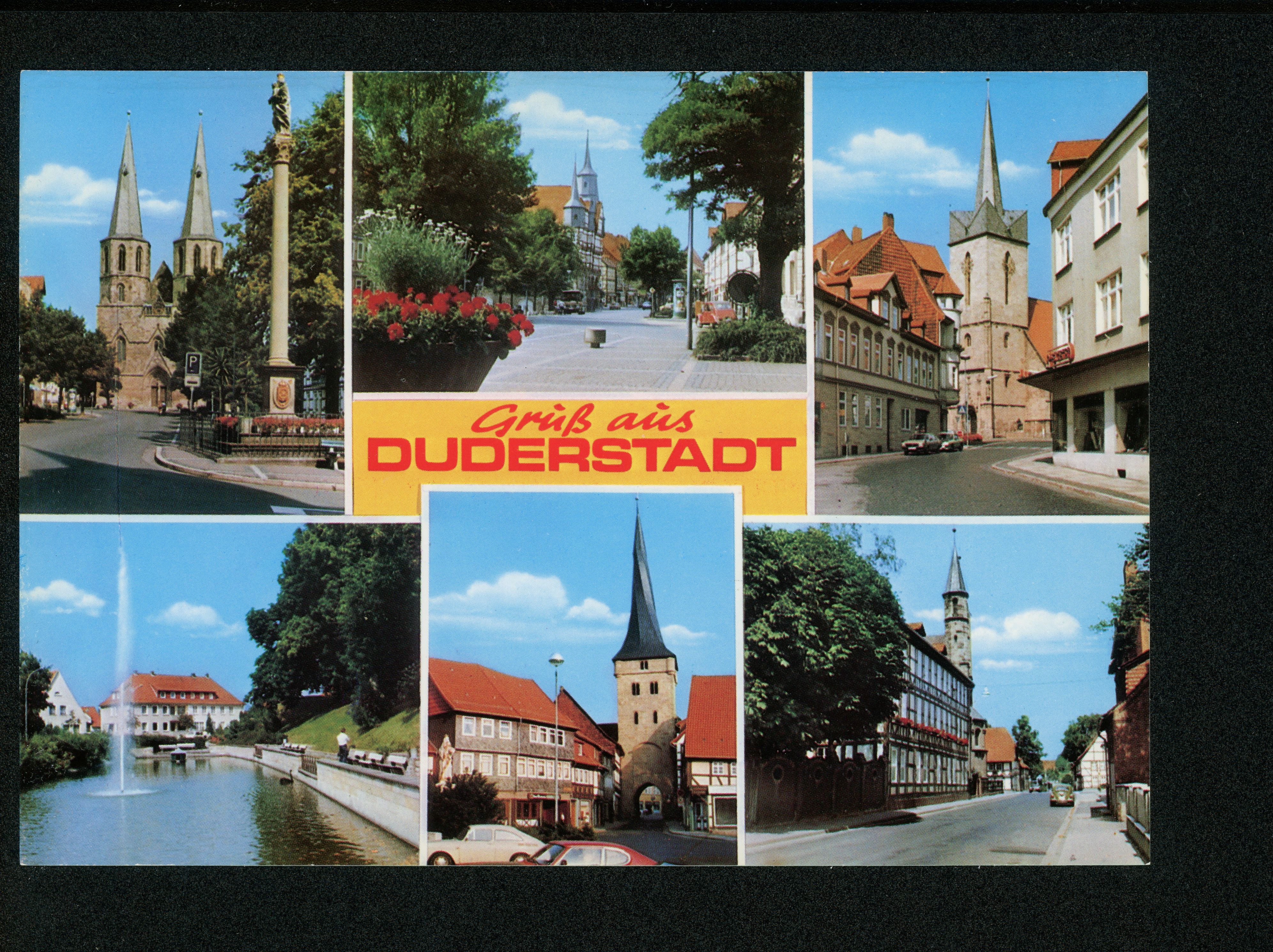 Ort Duderstadt Motive St. Cyriakus mit Mariensäule Marktstraße mit Rathaus Westertorteich Westerturm Bahnhofstraße mit St. Servatius Neutorstraße mit Liebfrauenkirche Format groß Verlag Gebrüder Seseke, Duderstadt Bestell- oder Individualnummer Nr. 1071