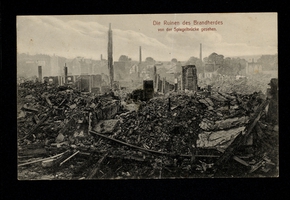 Die Ruinen des Brandherdes von der Spiegelbrücke gesehen |
