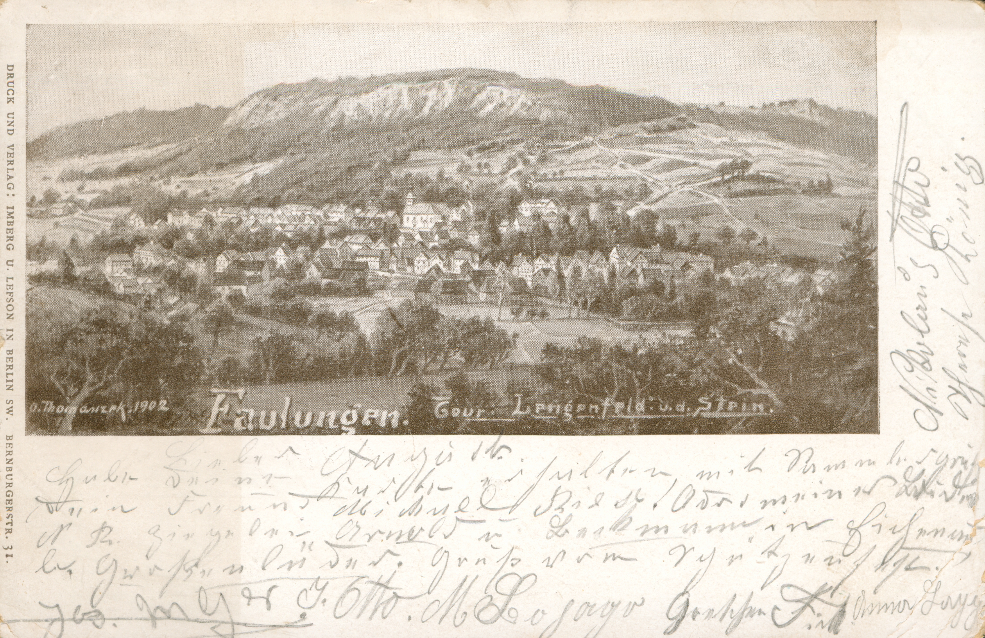 Ort Faulungen Beschreibung Künstler: Otto Thomasczek Sammlung: Oliver KrebsStandort: Gemeindearchiv Lengenfeld unterm Stein Motive Panorama Format klein Jahr 1902 Verlag Imberg u. Lefson, Berlin Bestell- oder Individualnummer - Tags Lengenfeld unterm Stein