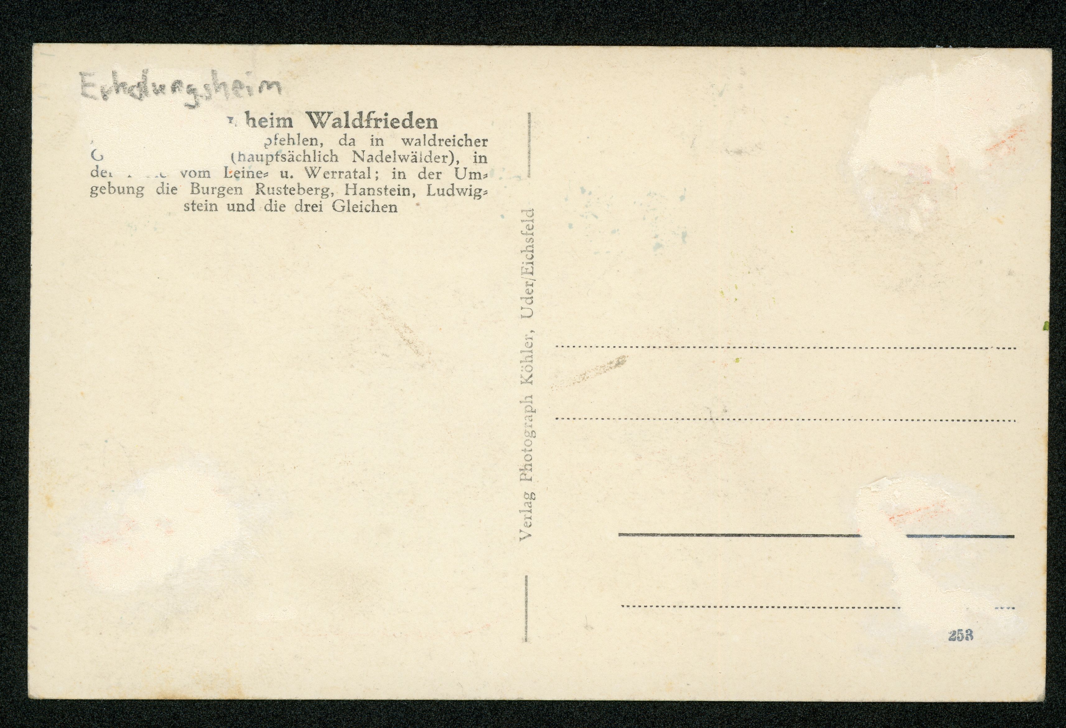 Ort Gänseteich Beschreibung Sammlung: H.M.D. Motive Dorf=Linde Erholungsheim = Waldfrieden von Adolf Jenssen Format klein Verlag Köhler, Uder Bestell- oder Individualnummer 253 Tags Gasthaus