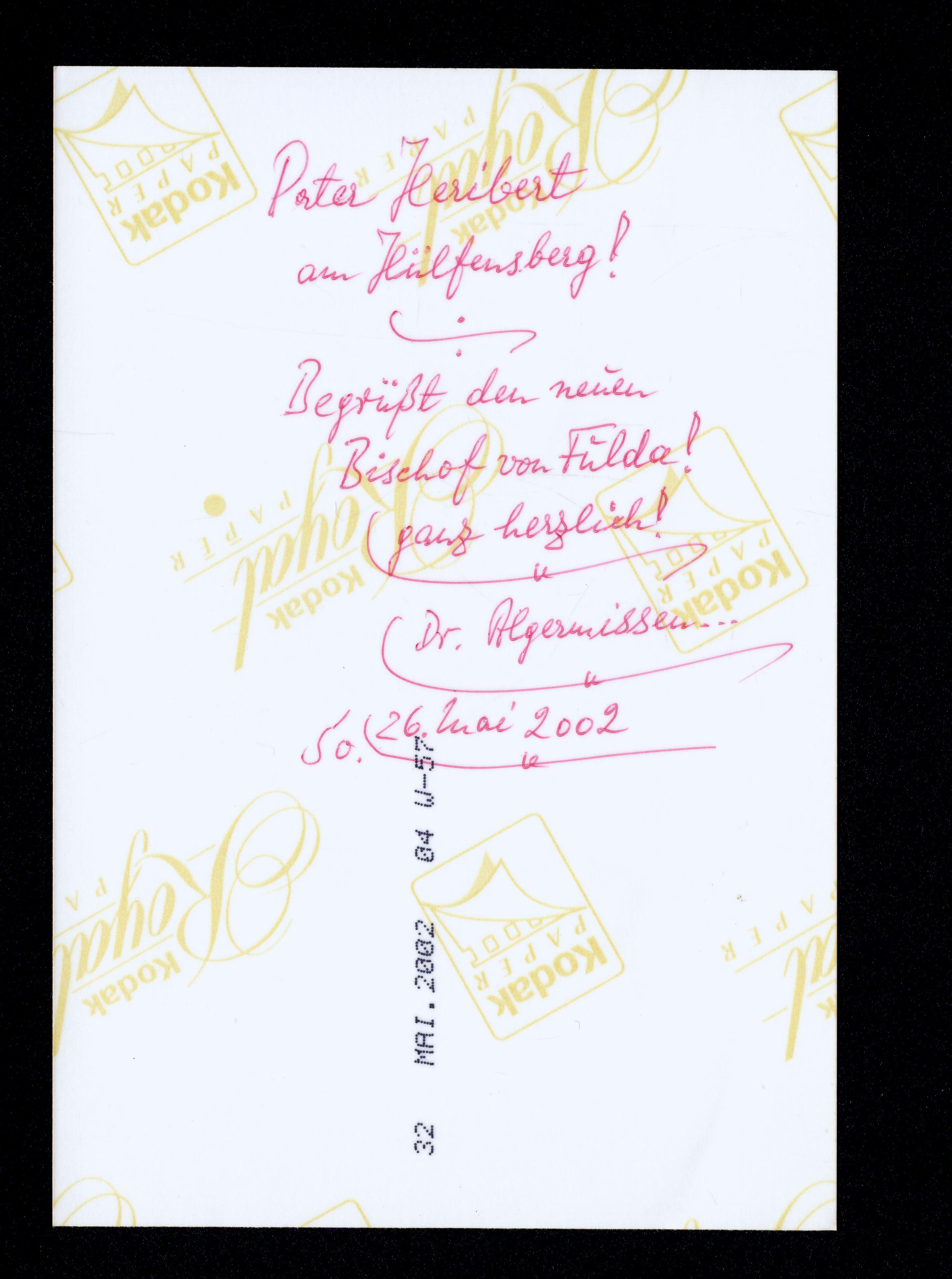 - Pater Heribert am Hülfensberg! Begrüßt den neuen Bischof von Fulda! ganz herzlich! Dr. Algermissen (Heinz Josef Algermissen (* 15. Februar 1943 in Hermeskeil) ist ein deutscher Geistlicher und emeritierter römisch-katholischer Bischof von Fulda.)