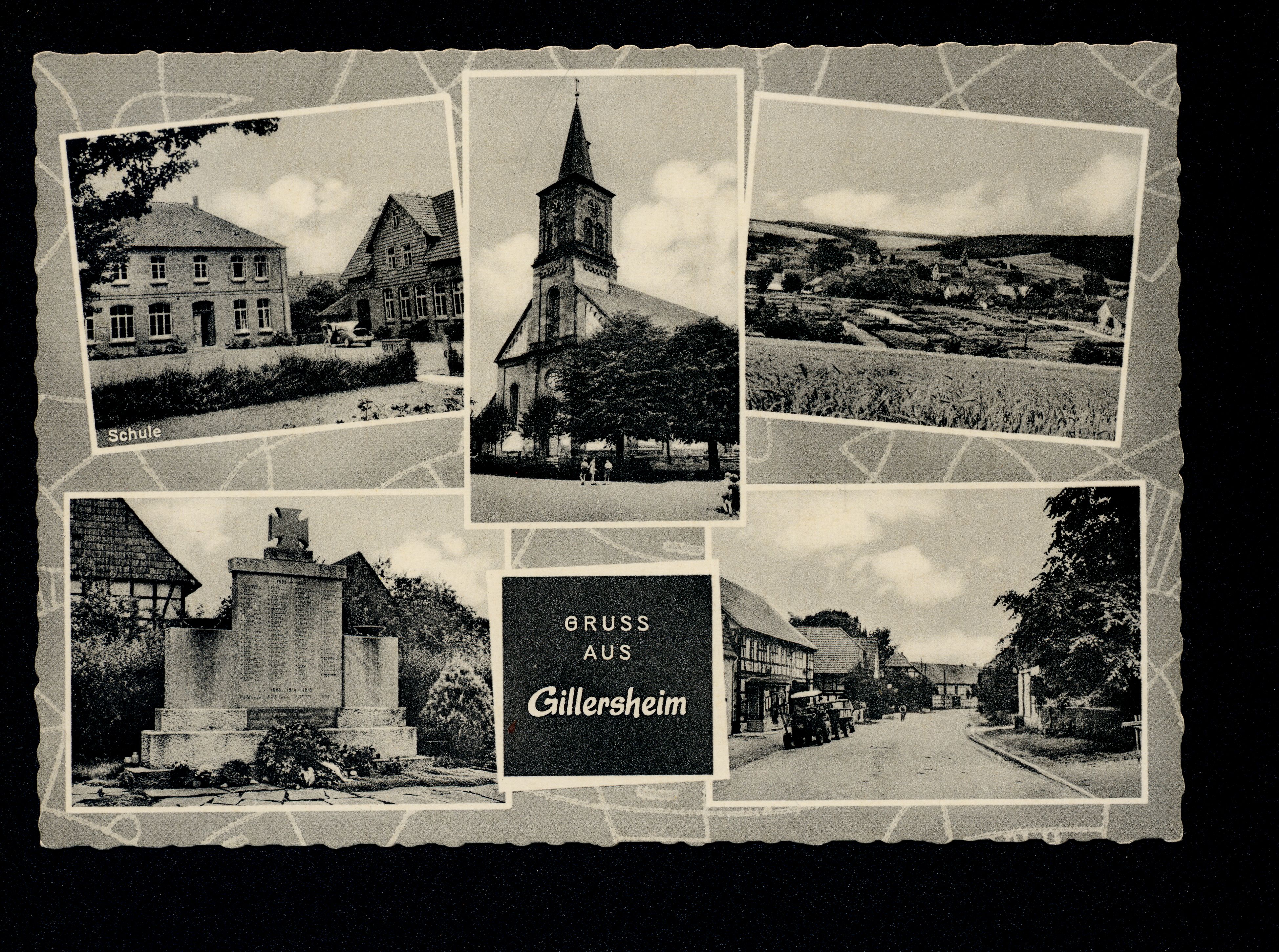Ort Gillersheim Motive Schule Kriegerdenkmal Kirche Panorama Straßenansicht Format groß Jahr 1962 Verlag Schmincke & Haase, Göttingen Bestell- oder Individualnummer 52/62 C63