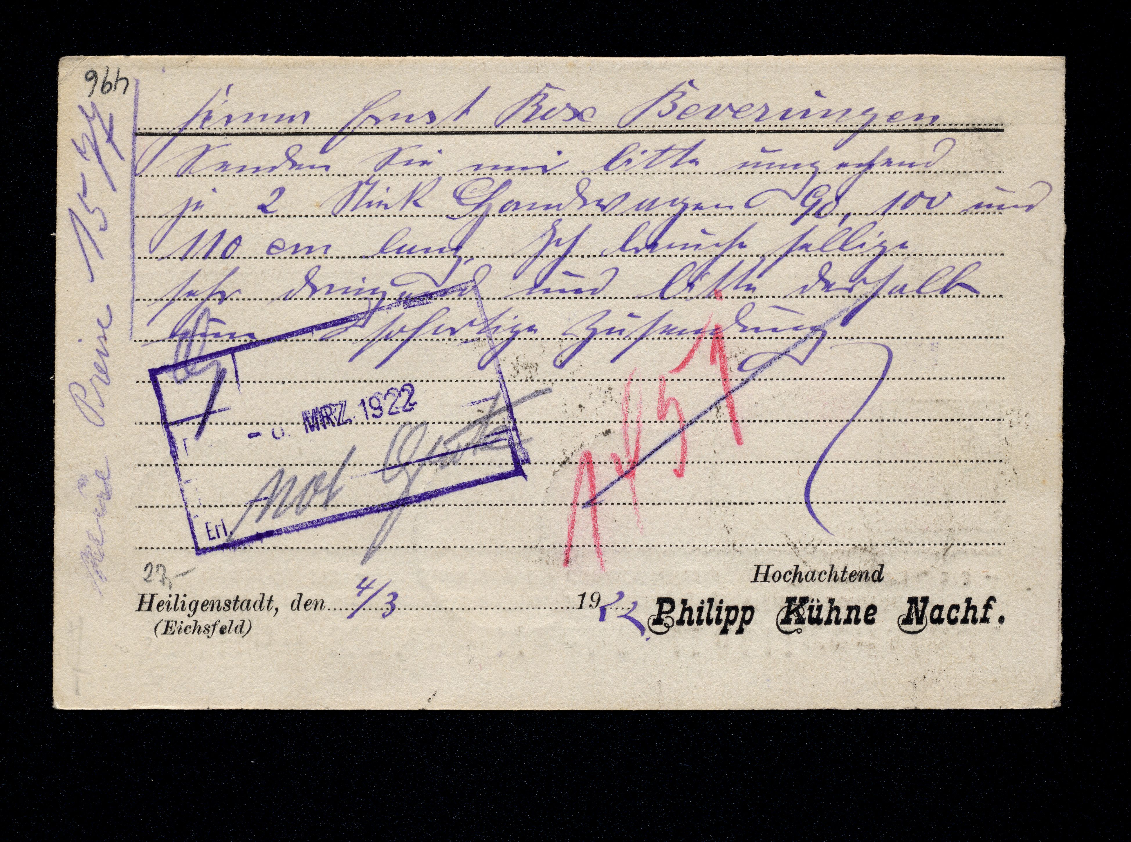 Ort Heiligenstadt Motive Philipp Kühne Nachf., Eisen- und Stahlwaren, Emaille, Haushaltungsgegenstände, Fahrräder Format klein Jahr 1922 Verlag - Bestell- oder Individualnummer - Versanddatum 04.03.1922